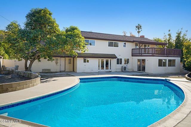 Beautiful corner pool home on an expansive parcel. This amazing property is located in a wonderful neighborhood and offers an array of highly desirable features. The home sits on a parklike corner lot with an impressive front yard. This blank canvas in ready to become a green thumb's paradise. Attractive hardscaping and mature fruit trees, and a long driveway provide plenty of parking and curb appeal. Step inside to discover gorgeous, tasteful, wood-like ceramic tile flooring throughout the entire downstairs. The bright and inviting living room features a striking stack-stone gas fireplace and opens to the family room which is an ideal space for an art studio, reading nook or sunny dining area. The beautifully remodeled kitchen is a chef's dream, complete with quartz counters, soft-close cabinetry, a center island, farmhouse sink, and stainless steel appliances. Enjoy the convenience of downstairs living with a spacious bedroom and bath featuring a double sink vanity and stunning stone/tile shower. Upstairs, the large, light-filled primary suite includes a private deck, generous closets and an ensuite bath. Two additional bedrooms offer ample closet space and share a remodeled full bath. The home also features a large laundry room with abundant cabinetry and outdoor access to the expansive backyard. Entertain or relax by the sparkling pool surrounded by patios, stone fountain and mature fruit bearing trees. There is a large built-in storage shed which adds even more functionality. Lots of room to add an ADU/guest house. Plenty of room to park an RV, boat or other vehicles. This exceptional property combines space, comfort and style. A perfect blend of indoor-outdoor California living. No HOA. Near Old Meadows Park, Conejo Creek Park, the Goebel Adult Center, Thousand Oaks Teen Center and Thousand Oaks Library. Don't miss this opportunity, your next chapter starts here!