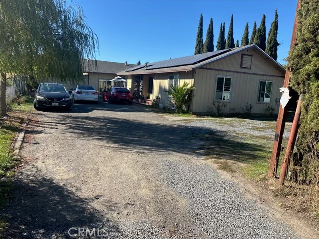 Welcome to this charming 3-bedroom, 2-bath home nestled in a beautiful neighborhood. The property features a secure gated entrance, a two-car garage, and a long driveway, providing both privacy and convenience. Inside, elegant vinyl flooring flows seamlessly throughout the home, creating a modern and inviting atmosphere. The spacious living room boasts a cozy fireplace and a large front-facing window, filling the space with natural light. Adjacent to the living and dining area, the kitchen offers ample countertop and cabinet space, fluorescent lighting, and a lovely view overlooking the backyard—perfect for everyday living and entertaining. The three generously sized bedrooms provide plenty of space for family or guests. Additional highlights include a two-car garage, a relaxing covered patio ideal for gatherings, and a storage shed for tools and equipment. The side yard connects to an expansive open area, offering endless potential for pets, gardening, or creating your own backyard retreat. This home also features a small solar system for added energy efficiency. Don’t miss the opportunity to make this warm and welcoming home yours!