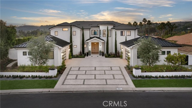 Perched at the end of a quiet cul-de-sac in the prestigious Hunters Creek community, this newly reimagined Modern Farmhouse represents the pinnacle of design, craftsmanship, and California living. Every inch of its 6,400 square feet has been thoughtfully rebuilt to exceed modern luxury standards while preserving warmth and character. Set on a 24,750 square foot lot with sweeping panoramic views of rolling hills, the home offers a rare blend of scale, serenity, and sophistication. Completely reimagined from the ground up with new plumbing, electrical, roof, and four HVAC systems, it combines timeless architecture with advanced performance. Smooth stucco graces the interior and exterior walls while oversized iron clad Marvin and Andersen windows fill the home with natural light and frame spectacular vistas. Inside, white oak hardwood floors, smooth walls, and modern flush doors with silver trim reflect a commitment to detail. The open concept great room features a statement marble accent wall, custom built cabinetry, and five expansive Cantina bifold doors that create a seamless transition to the California Room and outdoor living spaces. The chef inspired kitchen centers around an almost 14 ft Calcutta marble island and adjacent a 60" Wolf dual fuel oven, two 72" Sub Zero refrigerators, and built-in wine cooler by Sub Zero, a Miele coffee system, and both a butler’s pantry and walk-in pantry with custom millwork. Each of the five ensuite bedrooms is a private retreat, including the primary suite which captures sweeping sunset views from its private balcony and features a spa inspired bath with stone finishes and dual vanities. The open riser staircase, sculptural metal railing, and seven inch baseboards reinforce the home’s refined design language. Additional features include a main floor office, bonus room, mudroom, integrated sound system, smart home automation, owned solar, upgraded insulation, and PEX plumbing. Outdoors, the re-pebbled pool and spa are complemented by a water efficient landscape and architectural lighting that highlight the home’s contemporary lines. A four car-garage with modern doors, low HOA fees, and no Mello Roos complete this exceptional property. Every feature, finish, and system has been chosen to create a cohesive expression of modern elegance, comfort, and enduring California beauty.