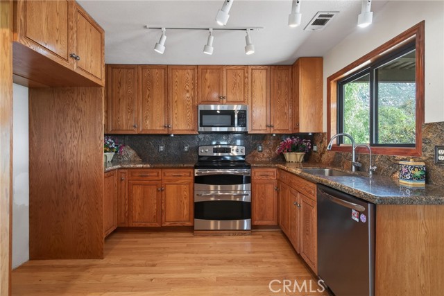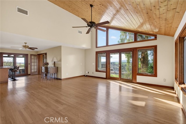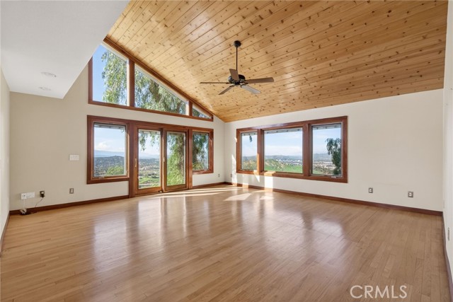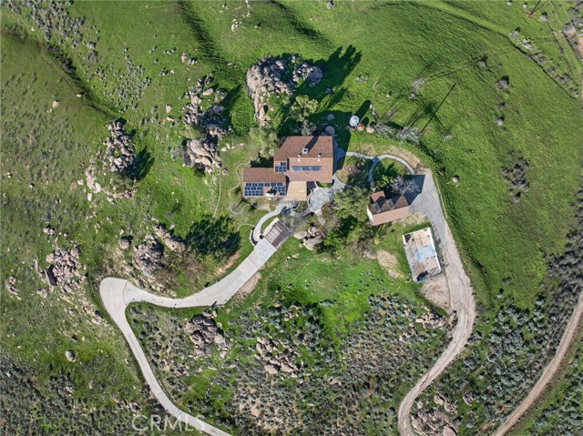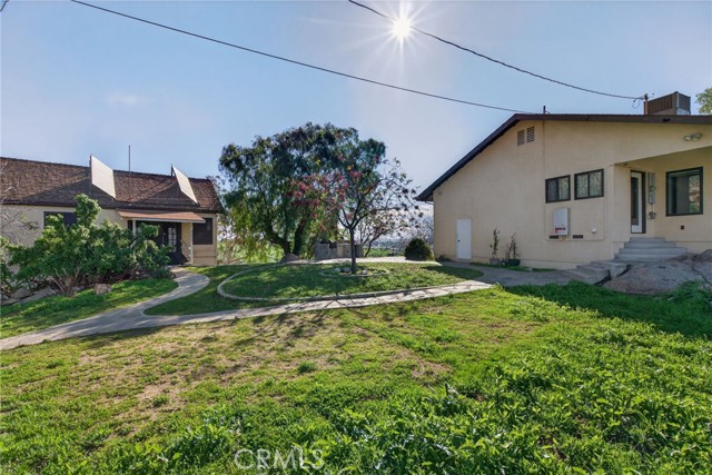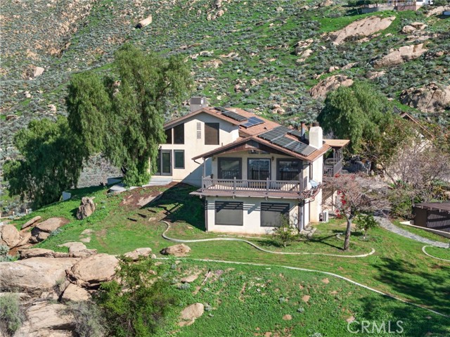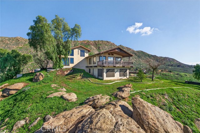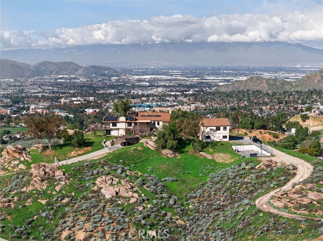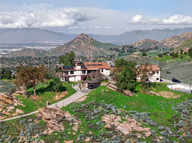 Imagine living in a serene hilltop custom-built home designed for luxury and modern convenience. Nestled in the Box Springs Mountain range, this home offers both privacy and expansive open living spaces. Perfect for those seeking off-the-grid living, this 12-plus-acre paradise offers the perfect blend of self-sufficiency and connection with two wells, solar panels, and two septic systems. Plus, you’re connected to electricity with the public utility providing extra peace of mind. Step inside to discover exquisite hardwood flooring and broad windows that flood the space with natural light and showcase breathtaking panoramic views. The vaulted natural wood ceilings in the living spaces provide a spacious atmosphere. There are two main living rooms, which both offer places for entertaining, dining, and enjoyment of this hill top paradise. The dining and living rooms boast unparalleled views of Mount Baldy, creating a mesmerizing backdrop for every meal and moment. Picture yourself relaxing on the living room balcony, taking in the stunning west-facing vistas of the mountains and twinkling city lights. With two bedrooms upstairs and a primary suite downstairs, this home provides fantastic flexibility for any lifestyle. The lower bedroom in the main home could easily be converted into a JR ADU, offering great potential for multi-generational living or additional revenue. Additionally, the property features a detached ADU which sits over the two-car garage. Also home has a half-court basketball court. The ADU has its own living area, kitchen, bedroom, and bathroom (450 sq ft +/-)—a fabulous bonus for guests or potential rental income. Zoned as R1, there's potential to subdivide the property for future investment or development opportunities. This hilltop retreat is your chance to experience the best of both worlds—secluded, self-sustaining living with the comfort and connection of modern amenities. Don't miss out on this unique opportunity to call this remarkable property your home.