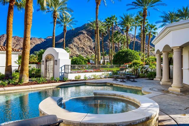 Nestled on an impressive 0.88-acre lot, this magnificent estate offers unparalleled privacy and luxury, with a motorized gate and circular drive leading to a stunning fountain courtyard. Positioned on the 6th hole of the prestigious Tradition Golf Club, the property enjoys prime views of the course, along with convenient access to the driving range and a short cart ride to the clubhouse and Coyote Cafe. This thoughtfully designed home features four spacious bedrooms, each with its own ensuite bath. The primary suite is a true retreat, offering breathtaking views of the golf course, a dedicated office, and an opulent bathroom with dual vanities, a soaking tub, a large shower, and a huge walk-in closet. The vaulted wood ceilings in the living room exude warmth and elegance, complemented by a wet bar perfect for entertaining. A gourmet kitchen opens into a cozy family room, complete with built-in cabinetry and a TV for relaxed living. The dining room provides a serene setting with gorgeous views of the courtyard, making every meal feel special. The third bedroom has been creatively transformed into an art studio, featuring beautiful built-ins that enhance the space's functionality. Additionally, the private casita offers a separate retreat, with its own living room, kitchenette, and an en-suite bath. The casita can be accessed through both the bedroom and the living area, ensuring ultimate privacy for guests or family. The property boasts a true outdoor oasis, with a sparkling pool and south-facing sun, ideal for relaxing and enjoying the beautiful desert weather. The yard is further enhanced by large palm trees, citrus trees, and a generous side yard with a large, attached dog house, making this the perfect home for pet lovers. Offered furnished per inventory.