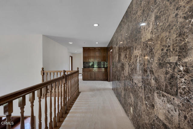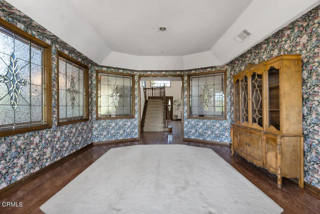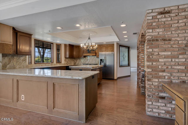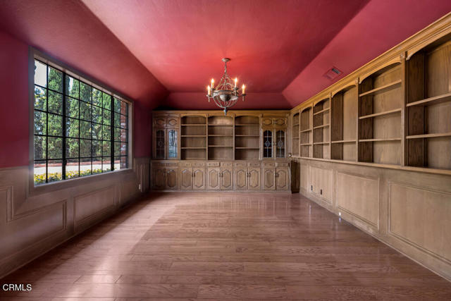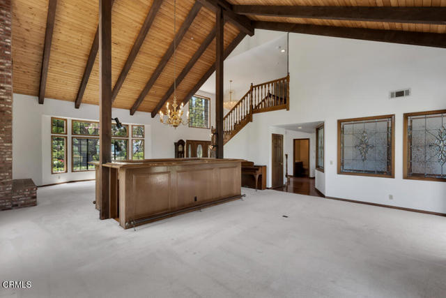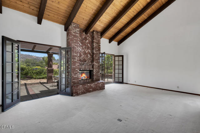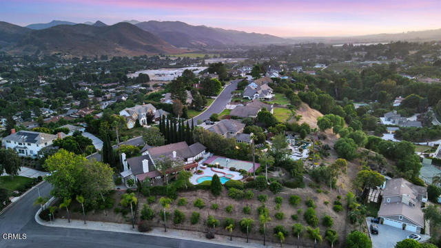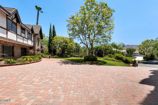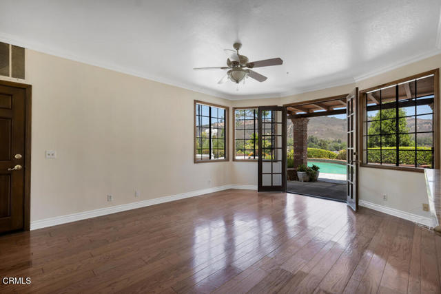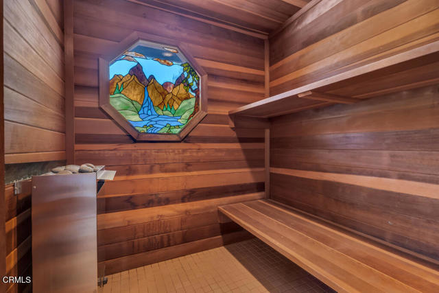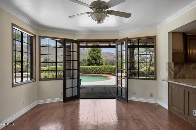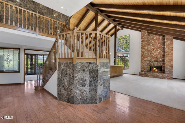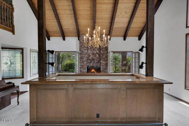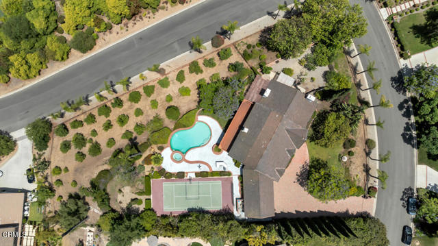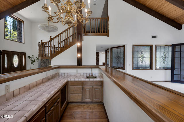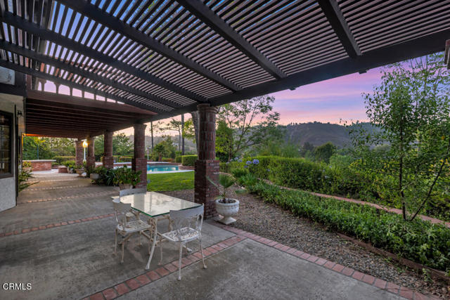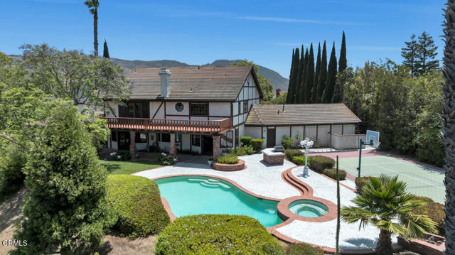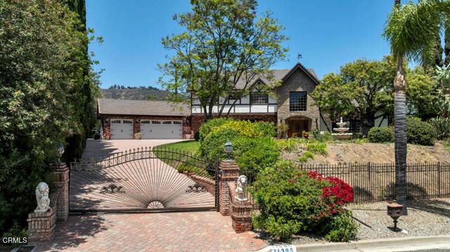 Perched above the valley behind private gates on over an acre, this custom Tudor-inspired estate blends timeless architecture, storybook charm, and old-world craftsmanship--offering panoramic views of the surrounding mountains. The brick and wood facade sets the tone for a property rich in character, with a resort-like backyard featuring a sparkling pool and spa, full sport court, covered patio, and dozens of mature fruit trees--all framed by lush gardens and a peaceful hillside backdrop.Inside, dramatic volume and warmth welcome you. The grand formal living and family room share one expansive space with soaring beamed ceilings, dual brick fireplaces at each end, and a custom-built bar anchoring the center. Natural light pours in through oversized windows and multiple French doors, creating effortless indoor-outdoor flow from every entertaining space--including the kitchen, dining, living, and family rooms.The kitchen is centrally located and ideal for entertaining, with granite counters, rich wood cabinetry, central gathering island, and a sunlit breakfast nook that opens to the patio. A formal dining room with French doors adds elegance and versatility. A downstairs en-suite bedroom with full bath provides a private space for guests or multi-generational living.Upstairs, the primary suite feels like a retreat, with vaulted tongue-and-groove ceilings, a cozy stone fireplace, and French doors opening to a large private deck with sweeping views. The spa-style bath features dual vanities, a large soaking tub beneath a picture window, expansive walk-in closet, walk-in shower, and a cedar-lined sauna with custom stained glass. Secondary bedrooms are generously sized with beautiful outlooks from every window.A large wood-paneled office/study offers built-in cabinetry, and a large picture window that fill the space with natural light and mountain views--perfect for working from home, a private library or media room.A grand staircase, wood flooring, custom built-ins, architectural detail throughout matched by richly layered outdoor spaces make this home one of a kind. Located in a private, character-rich hillside neighborhood, this is a rare opportunity to own a true California estate with soul, scale, and timeless appeal. Served by an award-winning K-8 school and centrally located in the Valley with easy access to nearby cities and amenities.