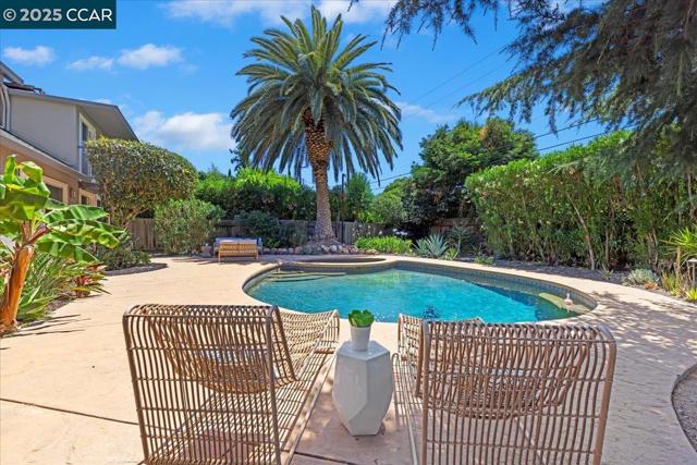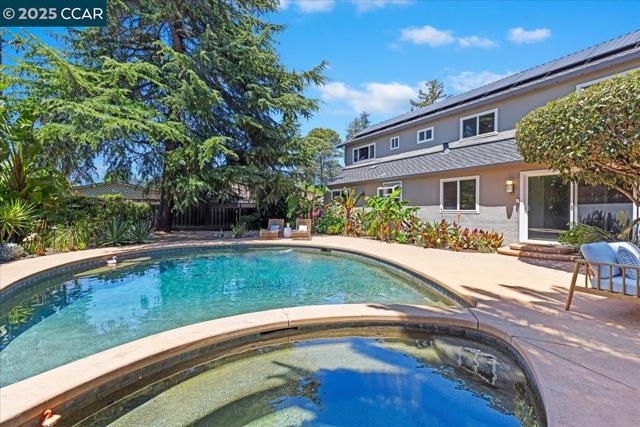 Open Sunday. This home is an amazing value, one of the best opportunities on the market in Walnut Creek. Incredibly spacious with soaring vaulted ceilings and abundant natural light in the living and dining rooms, creating a bright and open space perfect for both everyday life and entertaining. The thoughtful layout includes a huge downstairs bonus room that could be used as a fantastic separate entertainment space for enjoying movie or game night, or as an expansive home office or hobby room. Upstairs there are 3 bedrooms, including the primary with updated ensuite. A 4th bedroom downstairs is a second option for an in-home gym or office. Need a 5th bedroom or long term space for out of town visitors? The bonus room has an ensuite bath and its own slider leading out to the pool and garden. Outside, your private oasis awaits, with a beautiful, low-maintenance saltwater pool and spa surrounded by lush landscaping. Fully owned solar panel system and solar heat for the pool are included. This home is a blend of practical upgrades and thoughtful design. Buyer concessions are available to help with closing costs or a rate buydown.