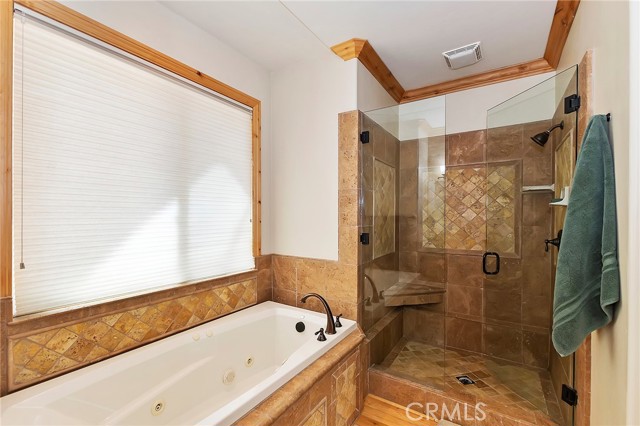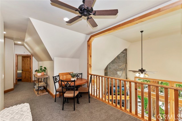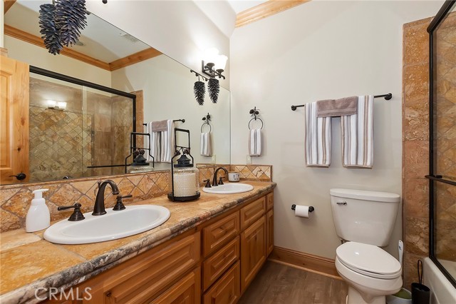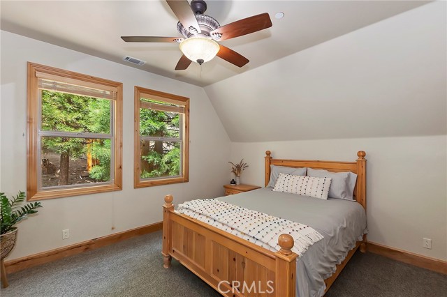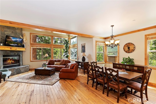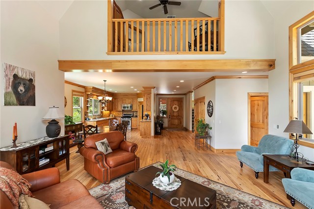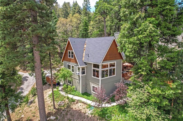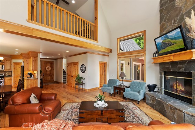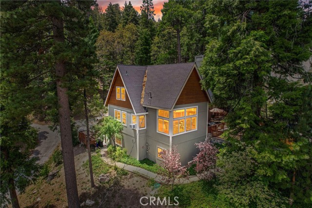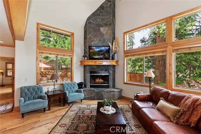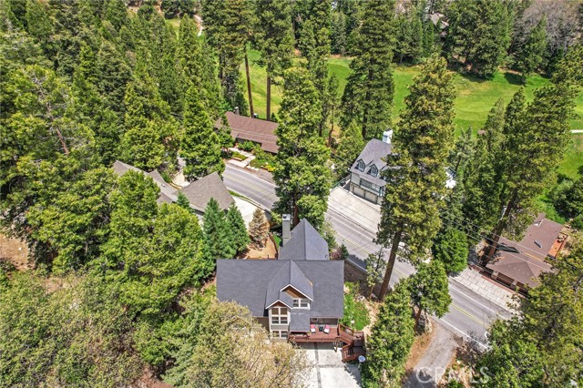 "Fore!" Watch out for this Golf Course Oriented Beauty! Located just across the street from the prestigious Lake Arrowhead Country Club Golf Course. A complete knock out this one is with Alder Cabinetry, Hickory Floors, Dual Level Windows, Attached and Direct Entry 2 Car Garage, Wine Cellar, and a Charming Patio for Summer Time in the Mountains. Enjoy single level living with an open floor plan an master suite on the main. The jaw dropping kitchen opens into the stunning dining & living spaces featuring a floor to ceiling fireplace as well as it is surrounded with natural light from towering windowscapes. The primary suite offers a walk-in closet, jetted tub, walk-in shower and direct access to the cool and quint patio. A balcony overlooks all of the livelihood and greets guests into one of three upstairs guestrooms with two additional baths, additional storage and built in office area. A bonus downstairs that could be anything you want, as well as landscaped grounds, adorable separate laundry room, and plenty of parking... even the driveway is fitted with stone accents and retaining wall surround. A total "Hole in One!", a special home for the full time or the anytime with a killer mountain setting.