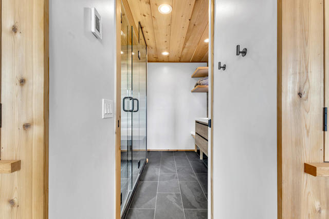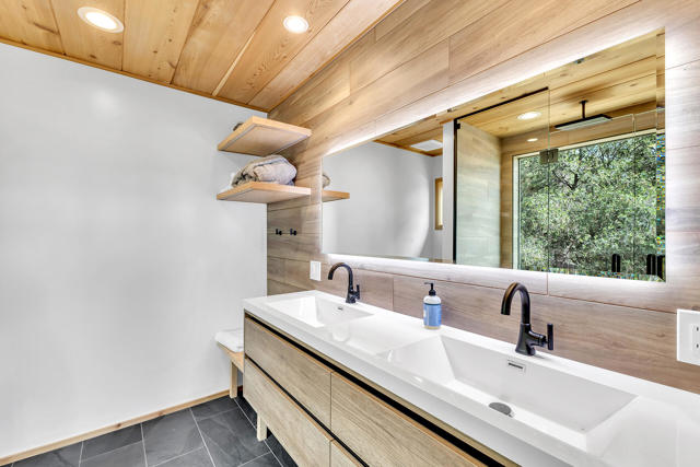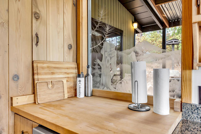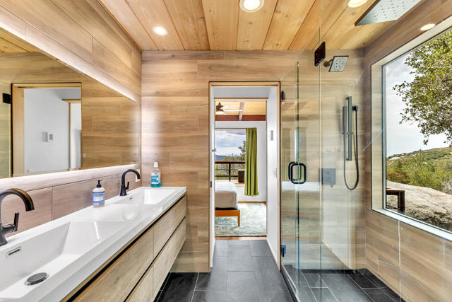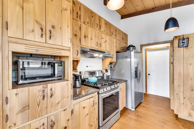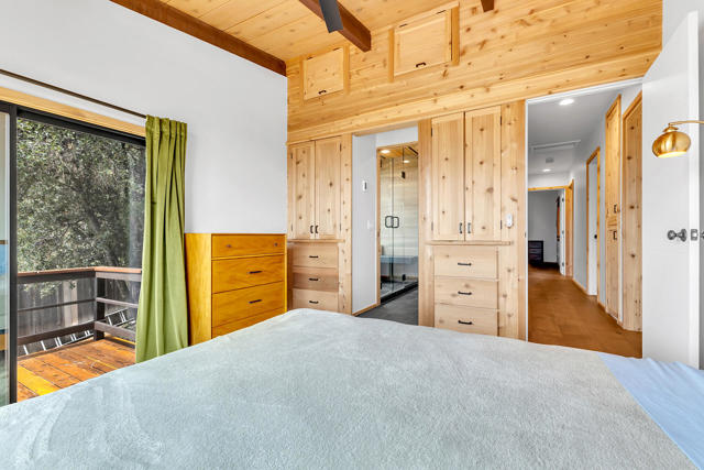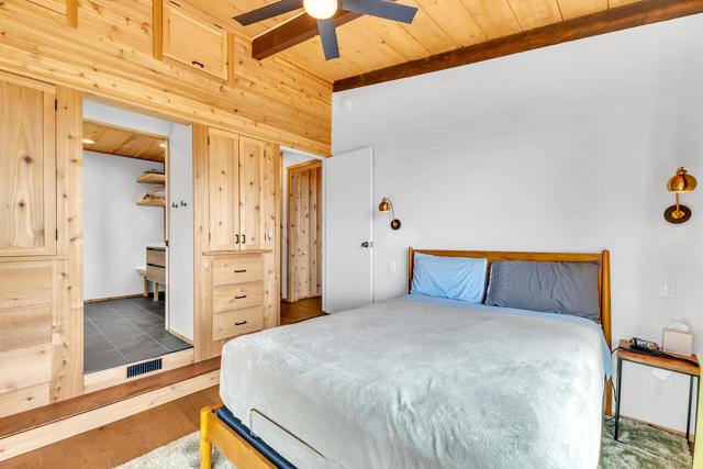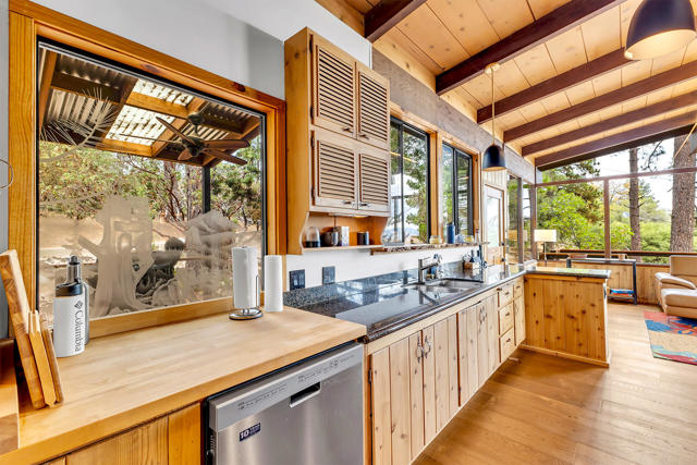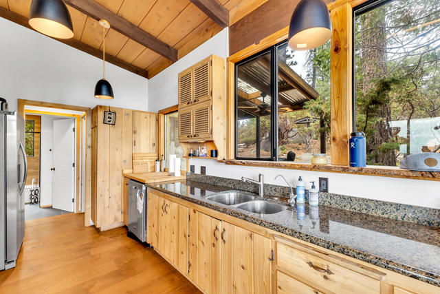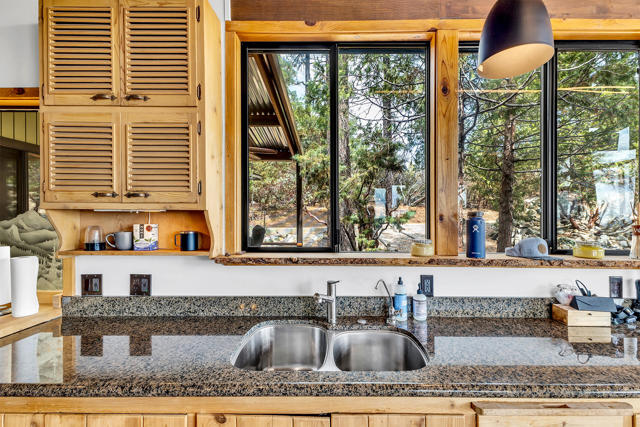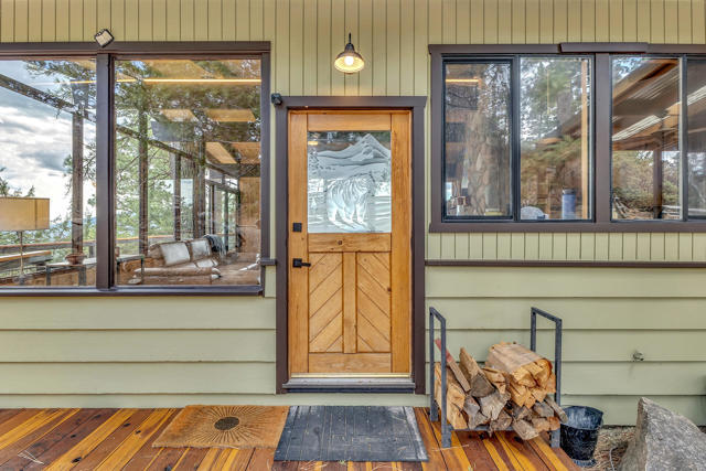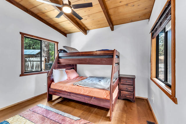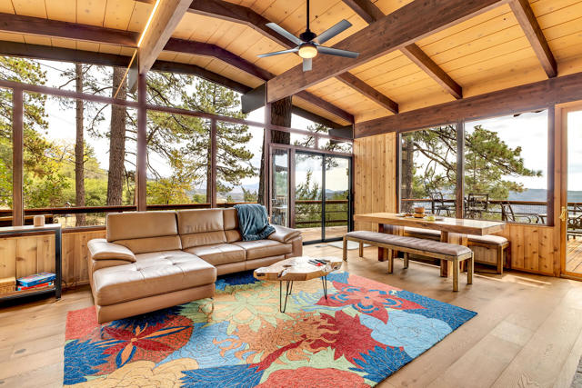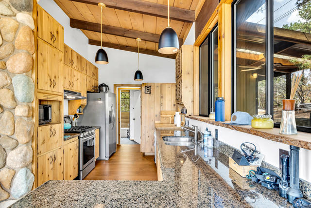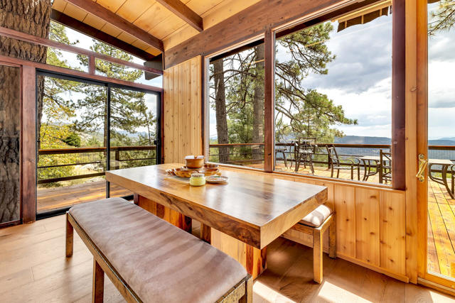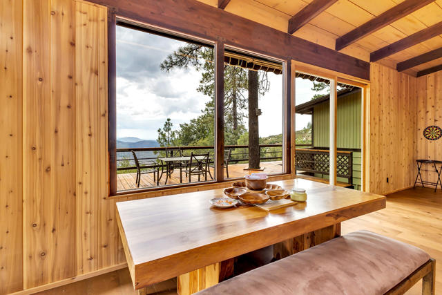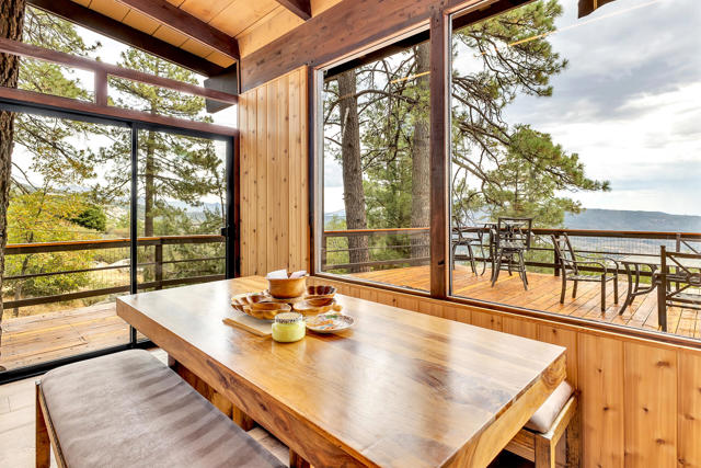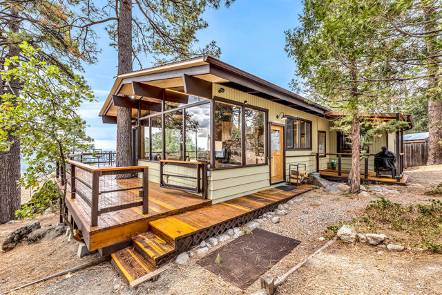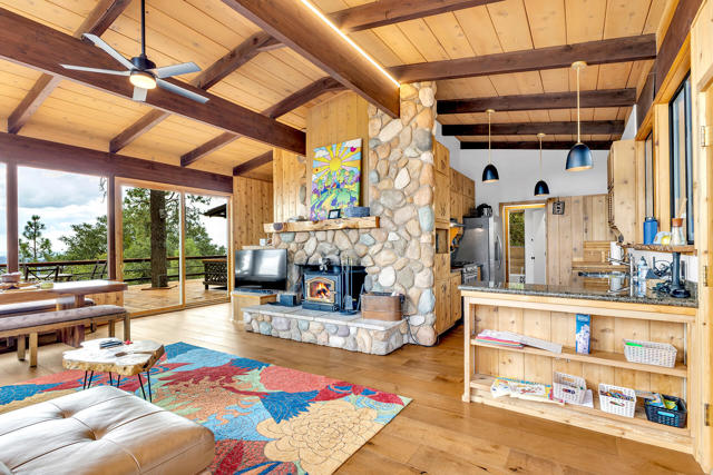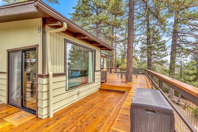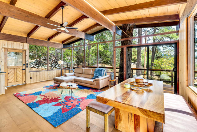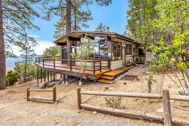 MID CENTURY MEETS MODERN RUSTIC. 1960'S Idyllwild mid century homes are characterized by open floor plans, multiple windows and expansive decks with dramatic views. This 1963 home represents one of the finest examples of this desirable combination, with a stunning open beam design of cedar interior, panoramic views from walls of glass and wonderful privacy. A large rock fireplace with airtight wood stove insert, anchors the dramatic open beam great room. The updated kitchen, highlited by original hand crafted cedar cabinets, has granite counters and stainless appliances. There are 2 bedrooms, 1.75 beautifully remodeled baths, wood floors, propane forced air heat and A/C, separate laundry/storeroom, and an extra downstairs office/sleeping room with Murphy bed. The large wrap-around decking, recently sanded and stained, offers additional outdoor living space with spectacular forever views. The usable property has fenced side yard, plenty of sunny exposures, ample parking and a freshly painted exterior. This is a wonderful combination of dramatic interior and exterior spaces, located in the desirable Double View Dr. area, on a quiet cul-de-sac street with little traffic.