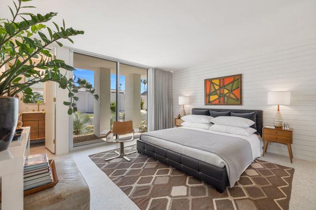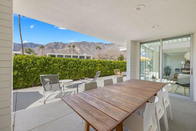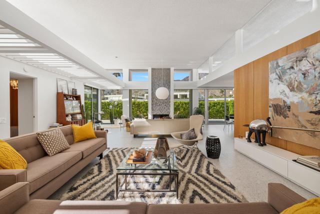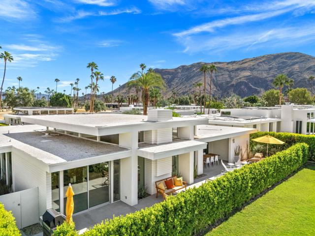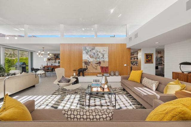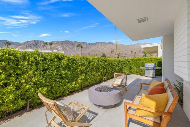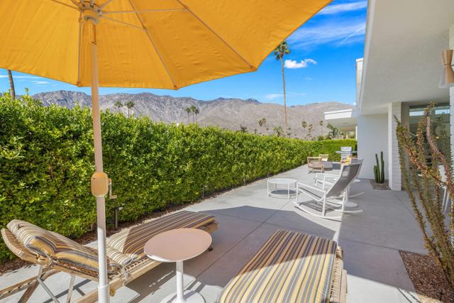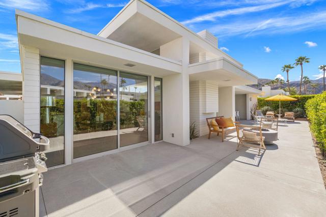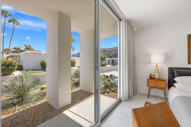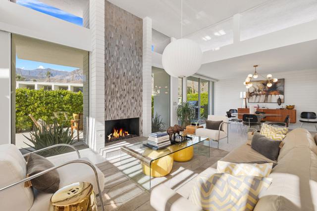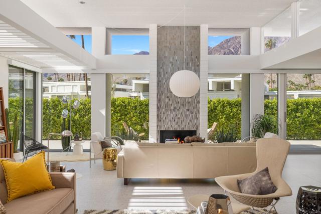 Set within the iconic Kings Point mid-century modern community of just 44 residences, designed by renowned architect William Krisel, homes in this exclusive South Palm Springs enclave are rarely available. Stunning and timeless, this home was completely remodeled and thoughtfully reimagined in 2024. It showcases iconic mid-century lines, high ceilings with clerestory windows, and seamless indoor-outdoor flow. The open-concept great room features walls of glass framing stunning mountain views, while the chef's kitchen boasts white oak cabinetry, quartz countertops, and premium appliances. The spacious primary suite offers a private retreat with direct patio access, a spa-like bathroom, and dressing room with custom wood cabinetry. Two additional en-suite bedrooms provide flexibility for guests or media space. Designed for entertaining, the home opens to a private patio with fire pit, BBQ, and inviting lounge area. Additional highlights include designer drapes, remote-control shades, Sonos sound system, custom fireplace, new flooring, 240v car outlet, and tankless water heater. Residents also enjoy tennis courts and two pools and spas, just steps away. Every detail of this home has been elevated, making this Krisel gem both architecturally significant and move-in ready.