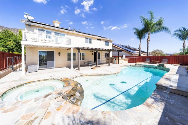 This beautiful 4-bedroom, 3-bathroom home with 3,581 sq ft is designed for both everyday comfort and special moments. Downstairs you’ll find a bedroom and full bathroom with direct side-yard access, making it perfect for guests or anyone enjoying the pool. The spacious kitchen with its large island is the heart of the home—ideal for cooking, gathering, and creating memories. Step outside and enjoy your own backyard oasis with a sparkling pool and spa, a covered patio for summer barbecues, built in barbeque area and gorgeous views you’ll never tire of. Upstairs, a large loft offers extra space for movie nights, playtime, or a home office. The primary suite is a true retreat, featuring a cozy bonus area that’s perfect for reading, exercising, or setting up a quiet workspace. Another bonus is the duel walk in closets that provide ample space and storage. From the private deck, you’ll love starting your day with sunrise coffee or winding down with stunning sunsets. A few added benefits are that the home has solar providing savings for warm summer months, located on a quiet cul-de-sac and a three car garage. This home is full of warmth, space, and charm—ready for you to make it your own!