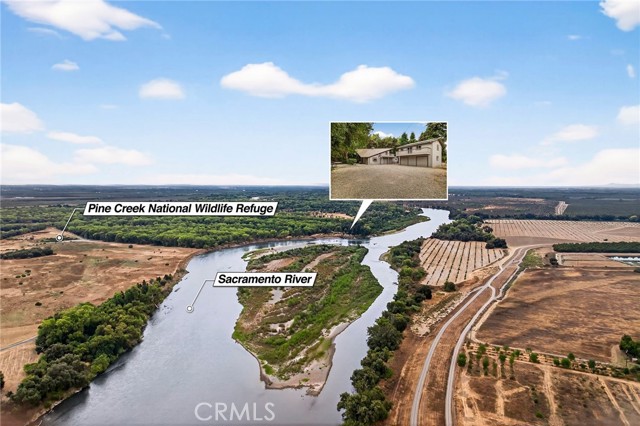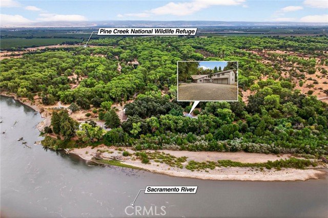 Riverfront Retreat Just 10 Minutes from Chico! Escape to your own private oasis on 3 RIVERFRONT acres, nestled behind Pine Creek Unit of the Sacramento River National Wildlife Refuge. The main home has been beautifully remodeled with new metal roof, electrical, new ductless zoned mini split heating and cooling system, owned solar, imperfect smooth drywall - the seller's haven't overlooked a thing! Enjoy a chef’s kitchen with Wolf range, leather top granite countertops, custom soft-close cabinets, and a custom rock range hood. Gorgeous two-story windows line the living room and add incredible natural light. There are new laminate floors, carpet, recessed lighting, and a striking wood-burning stove with a custom rock hearth create a warm and inviting atmosphere. The master suite is equally impressive with wood-beamed ceilings, wood-paneled accents, and a spacious walk-in closet. The second unit over the garage is also tastefully remodeled with it's own balcony, spacious open concept kitchen and living room, walk-in closet, making it ideal for guests, multi-generational living, or rental income. Outside, you’ll find a brand-new concrete patio, metal fencing, an oversized finished two-car garage, covered storage, 11 different varieties of fruit trees, and mature shade trees that add to the property’s charm. Don't miss this rare opportunity to own a slice of riverfront paradise, just minutes away from town. For full list of upgrades, features and more, call your favorite REALTOR today!