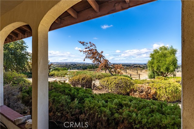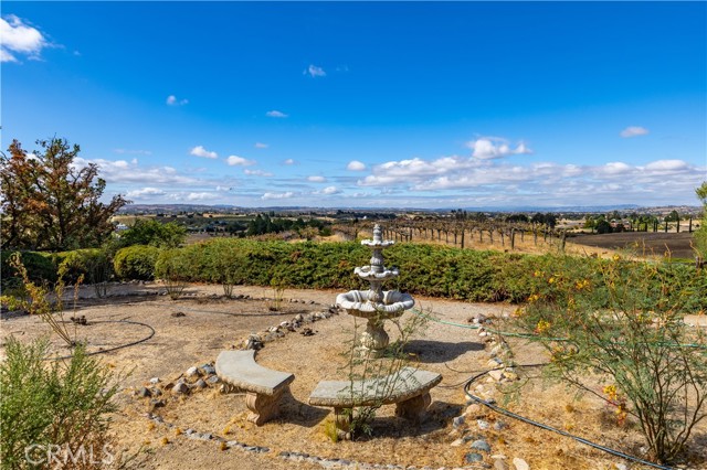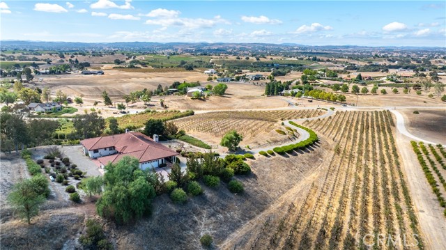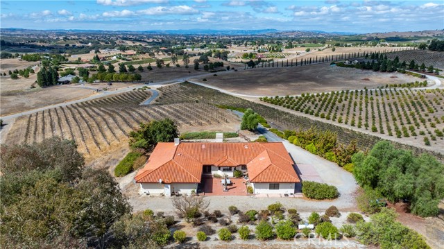 Nestled in Paso Robles wine country this 2972 sqft. home sits on over 9.5 acres with 5 acres of planted cabernet sauvignon vines. Enter the property on a paved driveway that take you to the top of the hill where the home is located with panoramic views. This Spanish style single level home has 2 living areas with windows that look over the vineyard and rolling hills of the countryside. The spacious kitchen boast a Sub-Zero refrigerator, island with cooktop, breakfast bar, dining area, and double glass doors that lead to the back courtyard. All bedrooms are on the same side of the house with the primary bedroom at the end. The first bedroom has a private entrance to the hallway bathroom. The second bedroom has a murphy bed. The primary bedroom and ensuite has a separate shower, soaking tub, and walk-in closet. On the other side of the house you will find the laundry room, third bathroom, and two double car garages. This property also has 2 outdoor living spaces. The front wrap around covered patio with view of your vineyard and the large back courtyard with 3 walls that break the wind. There is one well on this property for both the residence and vineyard use. Surrounded by wineries and located only 20 minutes from downtown Paso Robles and 15 minutes from downtown Atascadero you can live in the country with the conveniences of small town life.