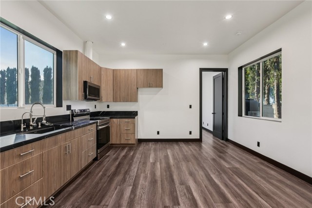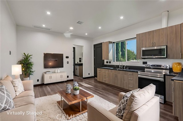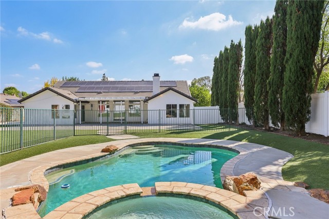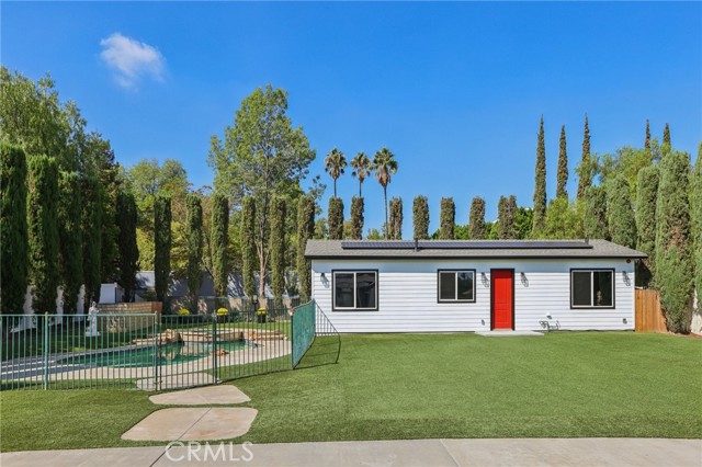 Experience effortless indoor-outdoor living in this remarkable single-story home in the gated community of Penfield Estates. With 2,682 square feet of living space on nearly a 20,000 square foot lot, this home features 3 bedrooms, 3 bathrooms, a spacious office, and a newly built, 700 square foot 2-bedroom ADU—perfect for hosting guests, accommodating extended family, or generating rental income. The home’s 52-panel solar system adds modern efficiency to a property designed for comfort and versatility. Step inside to a bright, open living area with vaulted ceilings and laminate floors, where natural light pours in through multiple windows and sliding doors opening to a private backyard oasis. The kitchen is a chef’s delight with high ceilings, concrete countertops, a center island, and wood cabinetry, seamlessly connecting to the family room for easy entertaining. The primary suite is a peaceful retreat, complete with a walk-in closet, high ceilings, laminate floors, and a spa-like bathroom featuring dual sinks, a separate soaking tub, and a walk-in shower. The front-facing office can easily function as a fourth bedroom, study, or creative space. Designed for entertaining and relaxation, the backyard features a pool, a spa with a cascading waterfall, a covered patio for shaded gatherings, and a spacious side area ready for a sports court or additional outdoor living. Additional highlights include a 3-car garage with ample storage and recent upgrades including a new AC, furnace, insulation, and pool heater. The all-electric 2-bedroom ADU provides flexible options for guests or rental income. Located in Woodland Hills, Penfield Estates offers the privacy and security of a gated community with easy access to Topanga Mall, Pierce College, local dining, and Ventura Boulevard. This home is an ideal retreat for those seeking space, style, and lifestyle in one of the area’s most desirable neighborhoods.