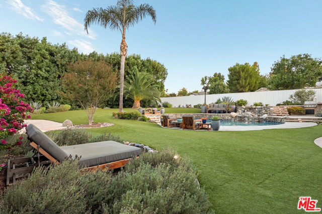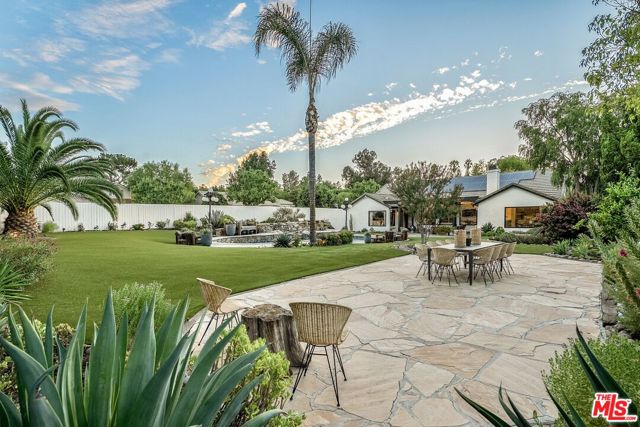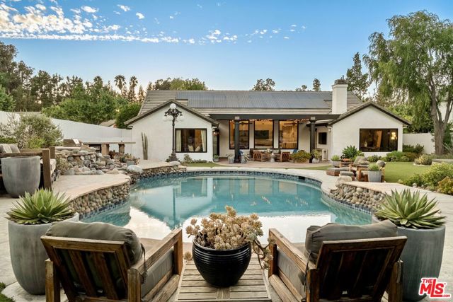 Tucked behind the private gates of coveted Penfield Estates, this single-story residence sits on a sprawling 25k+ sq ft flat lot and offers the ultimate in California indoor-outdoor living. With an open floor plan and thoughtfully curated upgrades throughout, this entertainer's paradise feels like a private resort designed for both relaxation and unforgettable gatherings. Boasting 4 beds/3 baths, the property features a saltwater pool and jacuzzi, a newly renovated chef's kitchen with custom cabinetry and quartz countertops, and expansive picture windows that frame serene views of the backyard oasis from the moment you enter. Additional highlights include a brand-new HVAC system, fully owned solar panels, built-in speakers throughout, custom built-in bar with 2 wine fridges, added built-ins for additional storage throughout and a whole-home water filtration system from LifeSource - just a small glimpse of the extensive upgrades thoughtfully integrated throughout the home. Step outside to two separate expansive patios - your personal havens for al fresco dining and lounging. Both front and backyards feature mature drought-tolerant landscaping, artificial turf, and a new irrigation system to effortlessly maintain its beauty. The primary suite is a true retreat, with wide-plank oak floors, a fully renovated spa-like bathroom, walk-in closet and French doors that open directly to the covered patio. Wake up to unobstructed views of the pool and lush backyard - your morning coffee never looked so good. This home offers far more than meets the eye, every detail has been elevated to create a lifestyle of comfort, luxury and connection.