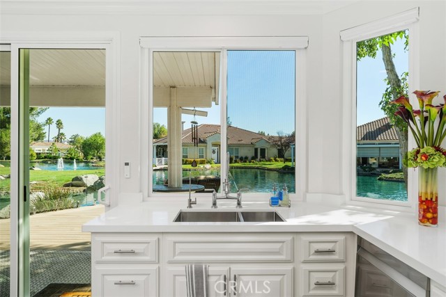 Lakefront unit with stunning 180 degree views. Located in the Country Club Lakes this unit has the prime location. Estimated at over 1900 sq ft after atrium enclosure, all on one single level. Fully remodeled unit from front to back with quality features and products including new windows throughout and new glass patio railing. Stunning kitchen with stainless steel appliances, lighting in upper glass door cabinets, custom crown molding, center island, quartz counters and see through fireplace. Living room with fireplace, lake views and slider leading to private patio. Separate dining room and office with french doors for privacy. Primary suite and en suite bath include: shutters, two separate closets, walk in shower, two separate sinks and center floating soaking tub……. better than going to the spa. Secondary bedroom with walk in closet and door to bathroom. Also featuring a den/3rd bedroom (no closet), your choice. Fabulous patio and extended decking over the lake perfect for entertaining or just relaxing. Two car garage plus golf cart garage with plenty of storage. This home is stunning on its own, add the premium location and it’s one of a kind….
