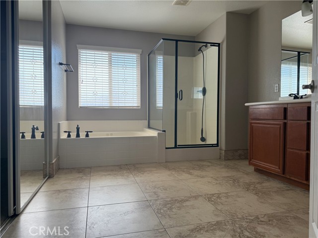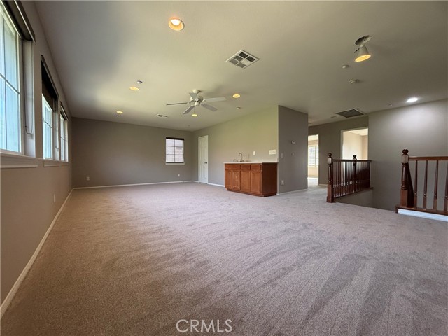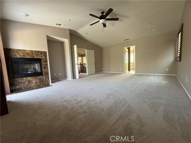 Welcome to this spacious 4BR, 3BA home in the highly sought after Sierra Lakes Golf Course community. Freshly painted interior with new carpeting. One bedroom and a 3/4 bath is conveniently located on the first floor. There is a built-in entertainment center in the family room, along with a large loft on the second floor for multipurpose use. The primary suite includes a cozy fireplace, jacuzzi tub, walk-in closet and private deck. Backed by the picturesque golf course and mountain view, the house is accompanied by a large yard for entertainment purposes. Conveniently located near the 210 freeway, a sports complex, shopping centers and local schools. No HOA.