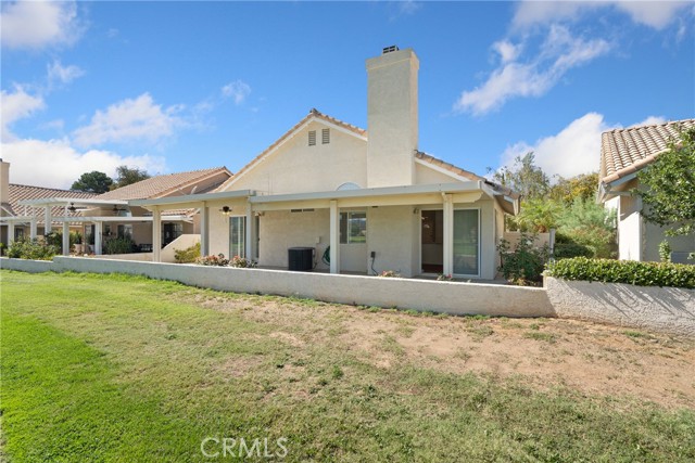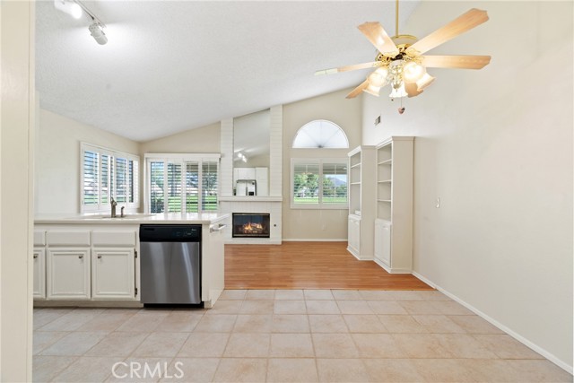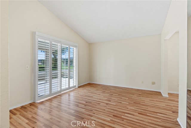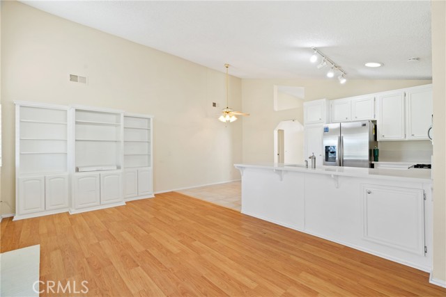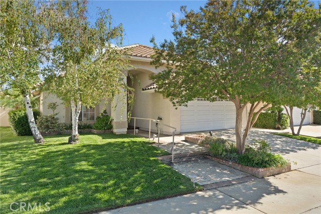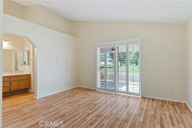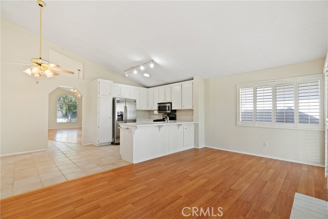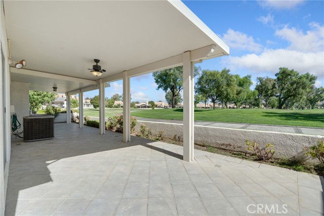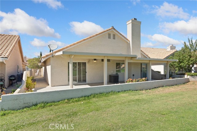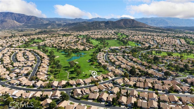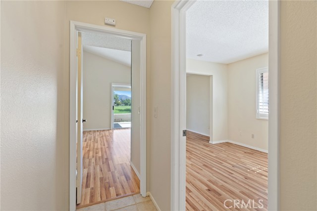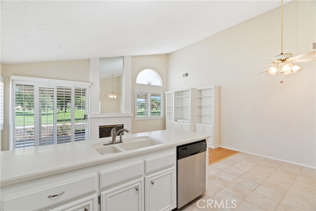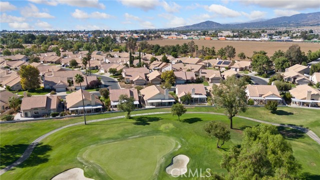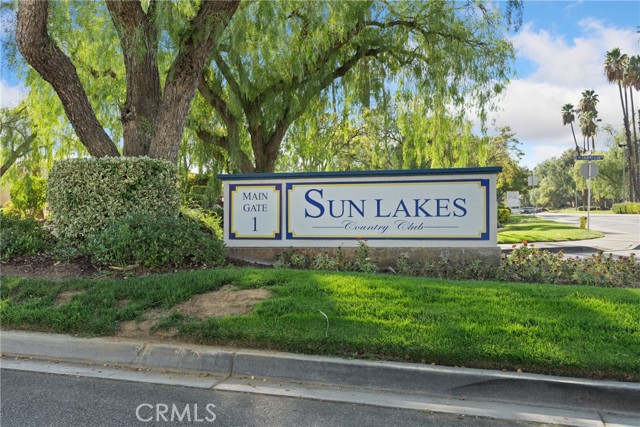 Situated on the first hole of the stunning Sun Lakes golf course, this Riviera model home offers beautiful views and a thoughtfully designed layout. The residence features wood laminate flooring throughout the living areas and bedrooms, complemented by ceramic tile in the entry, kitchen, hallways, and baths. Plantation shutters in the family room and primary suite add a touch of elegance. The kitchen is finished with Corian countertops, while the remodeled primary bath boasts dual sinks, Corian counters, and a custom-tiled shower. A versatile sitting area off the primary suite can be used as an office, reading nook, or easily converted into a third bedroom. The primary also includes a walk-in closet and sliding doors that open to the back patio overlooking the captivating golf course view. Outdoor living is enhanced with an Alumawood patio cover and tiled patio flooring, creating a perfect space to relax or entertain. The garage provides ample storage with built-in cabinets and an epoxy floor finish. Located in the highly desirable Sun Lakes Country Club, a 55+ guard-gated community, residents enjoy two golf courses, three clubhouses, multiple pools and spas (including an indoor pool), fitness centers, tennis and pickleball courts, dining, and a vibrant calendar of activities. Internet and cable are included in the HOA, and there is no Mello-Roos tax. Conveniently close to freeways and some of the best shopping in Southern California.