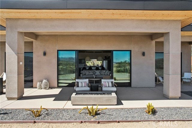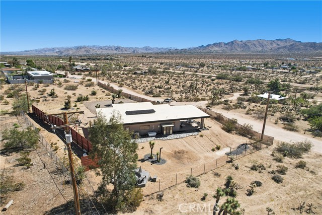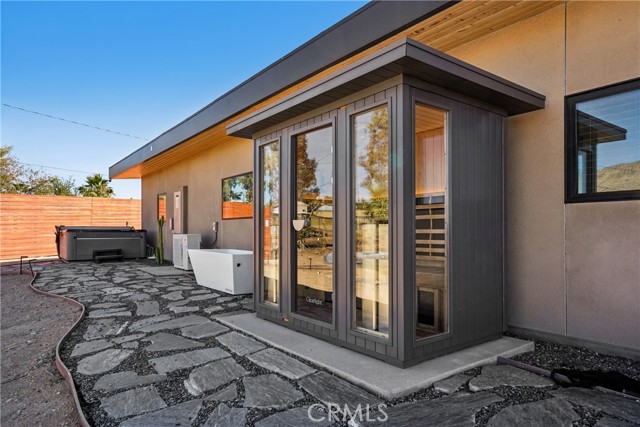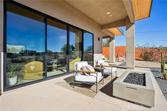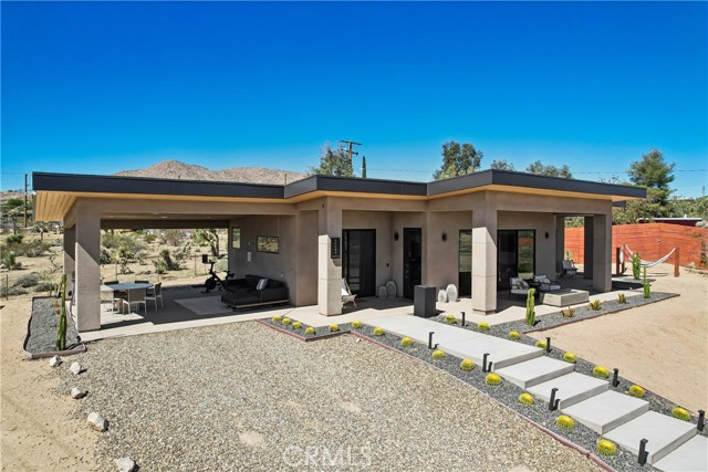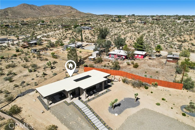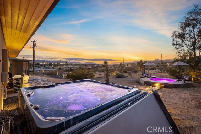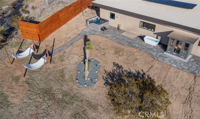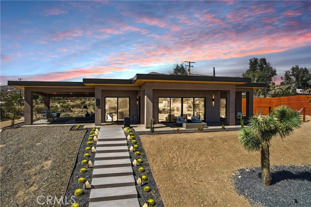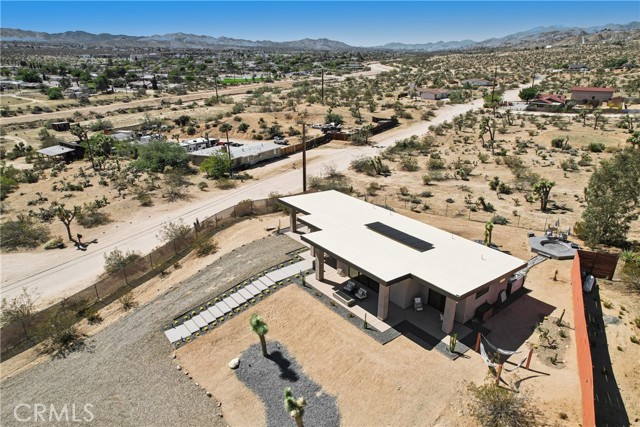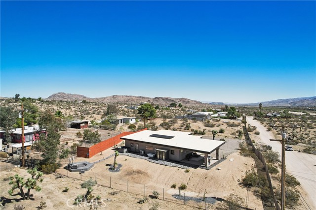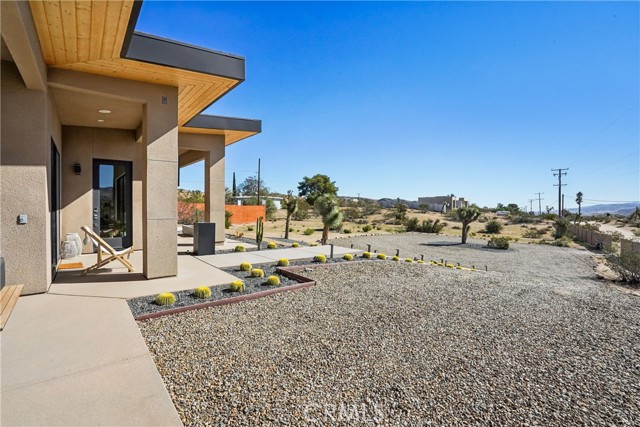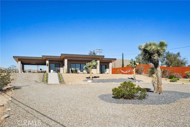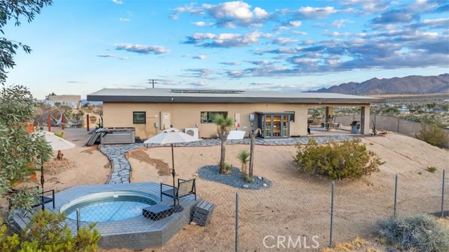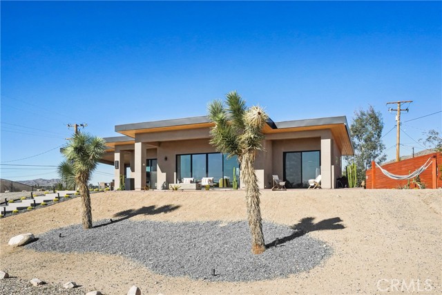 Welcome to 59080 Nelson Avenue — a newly constructed 2-bedroom, 2-bath modern desert retreat built in 2023, perfectly positioned in the sought-after Yucca Mesa neighborhood, just minutes from Joshua Tree National Park, Pioneertown, and downtown Yucca Valley’s shops and restaurants. This exceptional home seamlessly blends sophisticated design, smart technology, and serene desert surroundings for the ultimate indoor-outdoor lifestyle. The property is equipped with solar panels, providing energy efficiency and sustainability year-round. Currently operating as a highly successful Airbnb with numerous positive reviews, the home offers both investment potential and luxurious livability. Enter through the automatic gate into a fully enclosed property surrounded by a 10-foot wood privacy fence and lush, drought-tolerant landscaping with Bluetooth-controlled irrigation. Outdoor spaces were designed for relaxation and entertainment, featuring a custom deck, cowboy pool with lighting, Plunge cold plunge, jacuzzi, Clearlight UV sauna, gas fire pit, and RH fountain. Enjoy music through the outdoor SONOS speakers or unwind in one of the hammocks while taking in panoramic desert views. Every detail has been thoughtfully curated to create a seamless blend of comfort, privacy, and luxury. Whether as a full-time residence, weekend escape, or high-performing short-term rental, 59080 Nelson Avenue captures the essence of elevated desert living — where tranquility meets modern design, just moments from Joshua Tree.