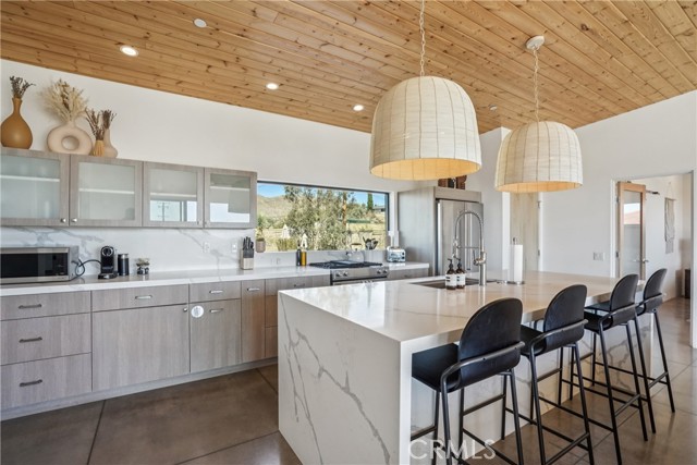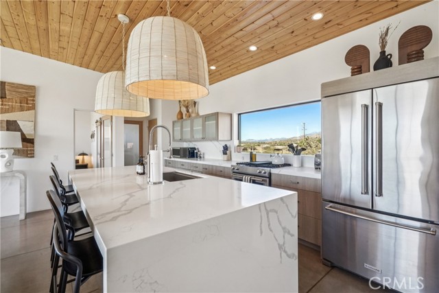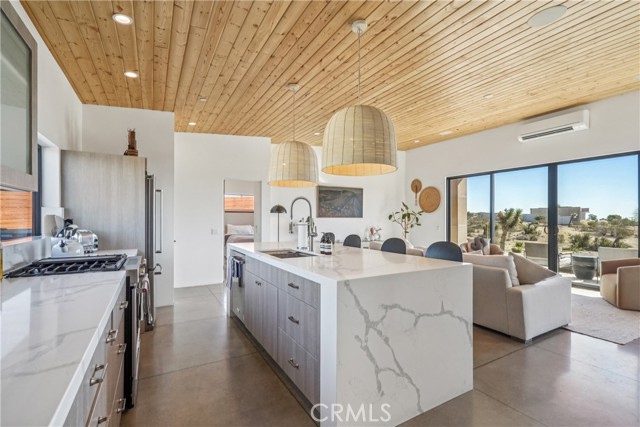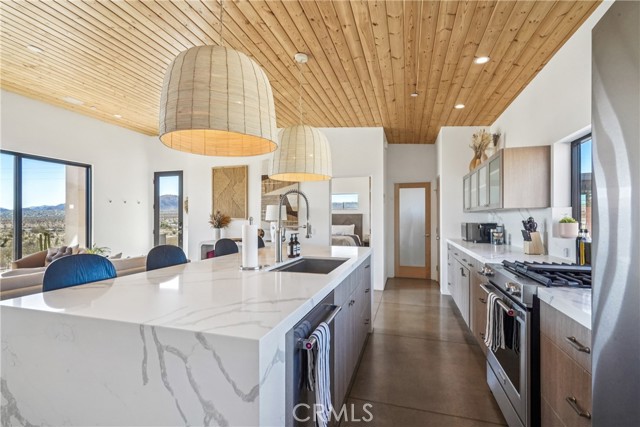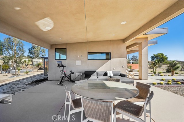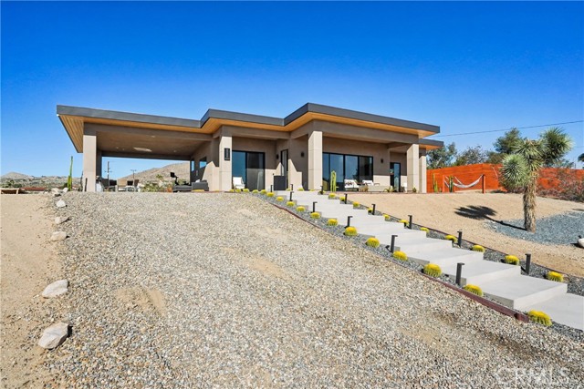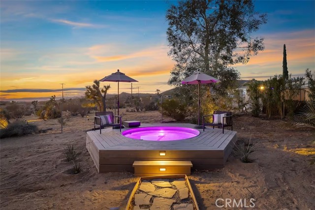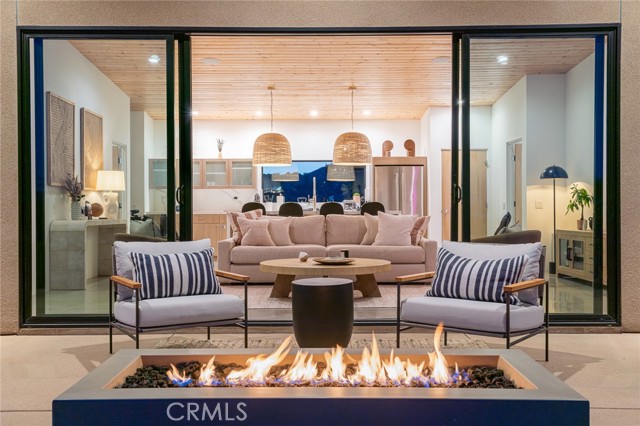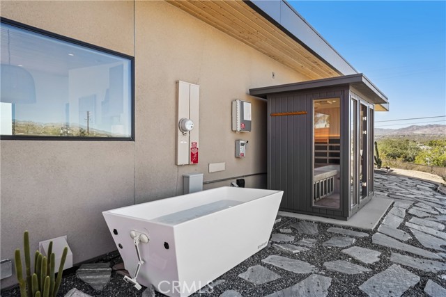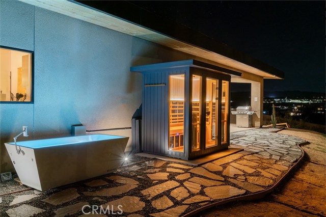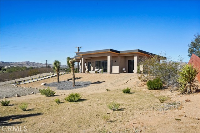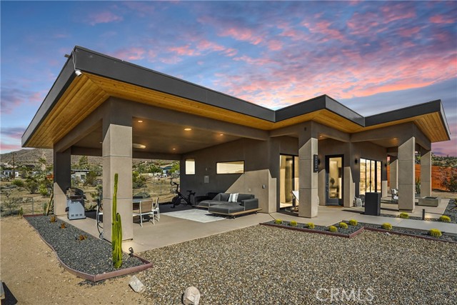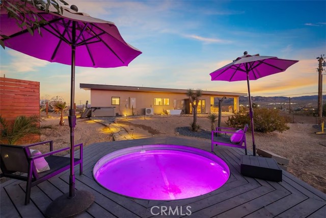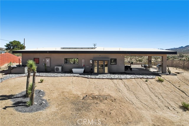 Welcome to 59080 Nelson Avenue — a newly constructed 2-bedroom, 2-bath modern desert retreat built in 2023, perfectly positioned in the sought-after Yucca Mesa neighborhood, just minutes from Joshua Tree National Park, Pioneertown, and downtown Yucca Valley’s shops and restaurants. This exceptional home seamlessly blends sophisticated design, smart technology, and serene desert surroundings for the ultimate indoor-outdoor lifestyle. The property is equipped with solar panels, providing energy efficiency and sustainability year-round. Currently operating as a highly successful Airbnb with numerous positive reviews, the home offers both investment potential and luxurious livability. Enter through the automatic gate into a fully enclosed property surrounded by a 10-foot wood privacy fence and lush, drought-tolerant landscaping with Bluetooth-controlled irrigation. Outdoor spaces were designed for relaxation and entertainment, featuring a custom deck, cowboy pool with lighting, Plunge cold plunge, jacuzzi, Clearlight UV sauna, gas fire pit, and RH fountain. Enjoy music through the outdoor SONOS speakers or unwind in one of the hammocks while taking in panoramic desert views. Every detail has been thoughtfully curated to create a seamless blend of comfort, privacy, and luxury. Whether as a full-time residence, weekend escape, or high-performing short-term rental, 59080 Nelson Avenue captures the essence of elevated desert living — where tranquility meets modern design, just moments from Joshua Tree.