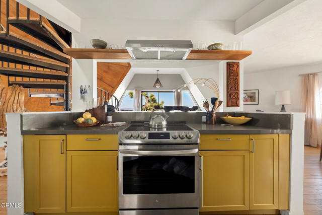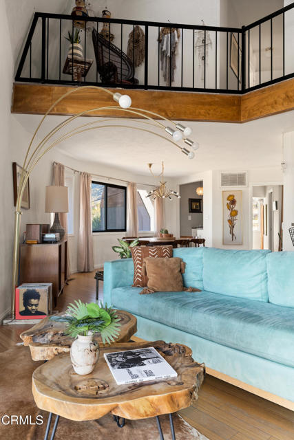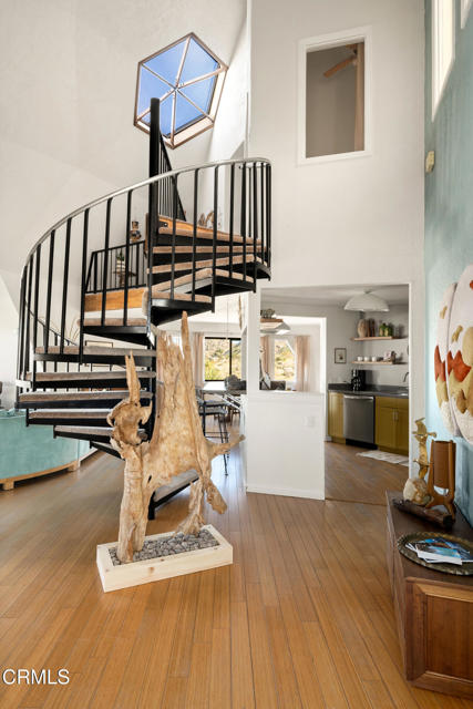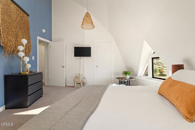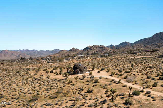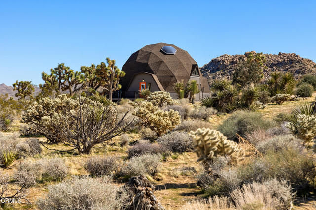 This architectural jewel sits amidst Joshua Trees on over two acres in Upper Friendly Hills. 7677 Wilton Rd is a striking Buckminster Fuller-inspired geodesic dome with soaring ceilings, dramatic skylights, and stunning views of the surrounding mountains and desert. The lower level welcomes you with bamboo flooring and a bright, open layout that flows between the living, dining, and kitchen areas. The kitchen features colorful accents and stainless steel appliances, while the spacious primary suite offers a generous bedroom, large closets, and an en-suite bath. A spiral staircase leads to the lofted second level, where two additional bedrooms with unique triangular windows overlook the grounds. A modern bath showcases designer tile and dual sinks, and a flexible bonus room provides extra living space. Designed to capture natural light and frame the desert sky, the dome's wooden hexagonal details and abundant skylights create a uniquely beautiful atmosphere. Outdoors, the property offers a wraparound deck for al fresco dining, a propane fire pit, and a hot tub perfect for stargazing. With thoughtful upgrades including a newer roof, windows and sliding doors, an updated AC condenser, refreshed baths, and a newer hot water heater, this extraordinary home blends architectural wonder with modern comfort. Whether envisioned as a serene family retreat or a one-of-a-kind vacation escape, this desert dome presents the rare opportunity to live inside a work of art.