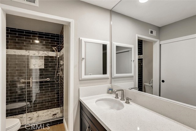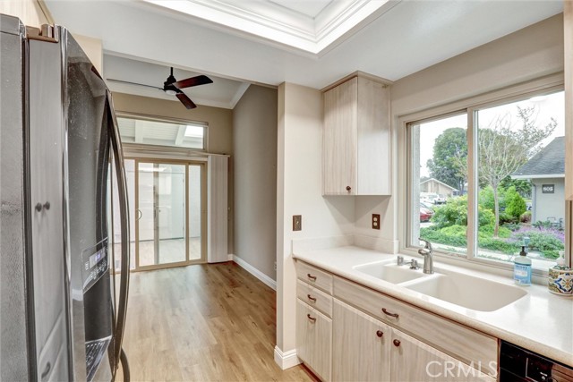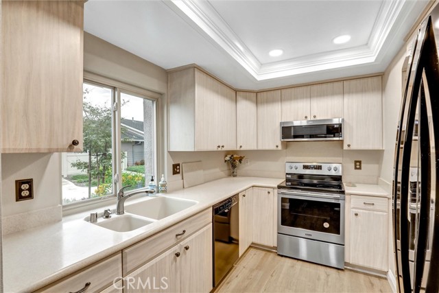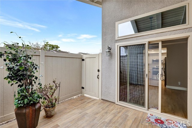 Welcome to the Iconic Landmark-- a surf city gem. Ocean breezes keep the weather temperate year round. Sustainable lush landscaping throughout Landmark. Just minutes to the beach in coveted Huntington Beach. This friendly 55 and up community has all the amenities. Two Community Pools, Clubhouses, Guarded Security Gate, Tennis/Pickleball courts, Events, Concerts, Clubs, Billiard Room, Putting Green, Fitness Center, and activities galore. Enjoy the expansive green space easy to walk or bike in this enchanting Community. This gem boasts a beautiful 2 Bedroom and 2 full baths corner unit condominium with high ceilings and a skylight in the main bathroom, ensuite in the Primary Bedroom, and updated laminate flooring. Two double closets in the Primary and one double in the 2nd bedroom plus 2 hall closets allow for lots of storage. Ceiling fans in dining and bedrooms. Kitchen though not large, has a soothing design, great layout and functionality for any cook. Features in the kitchen include a built in microwave, pull out dedicated spice storage, beautiful over the sink window, and a corner cabinet with rounders for pots and pans. Two sets of sliding glass doors open to a patio with high walls for privacy and there you will find access to the enclosed washer and dryer with more storage. Easy ample parking. The one-car garage is detached with ample storage space. Easy access to the main Clubhouse. Blocks away from Beach Boulevard, PCH and shopping centers, cafes and the cool vibe of beach living. Come visit Landmark and you will want to stay!