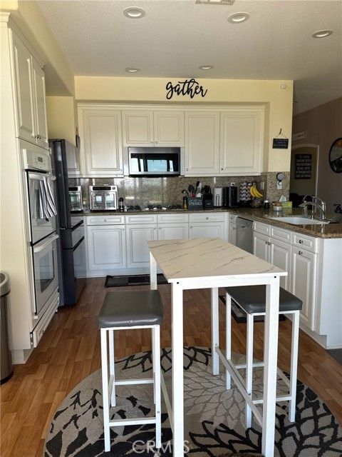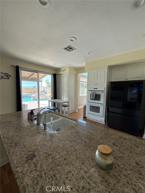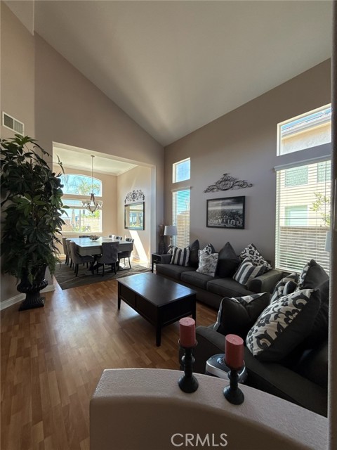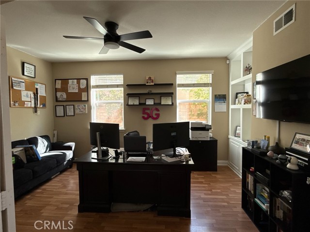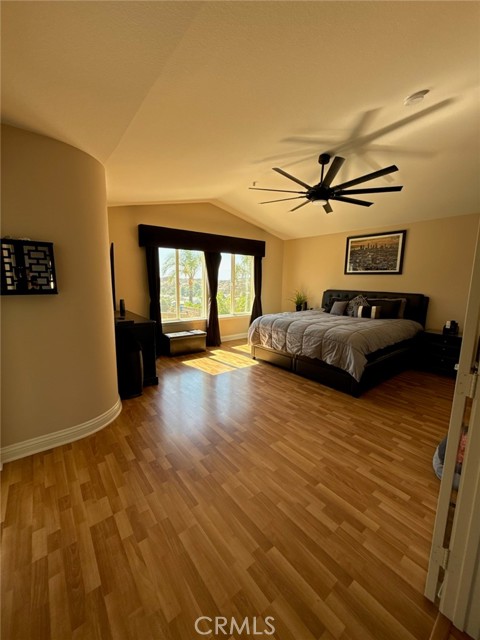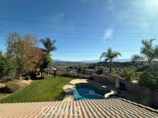 Spectacular views from this beautiful former model home on a cul-de-sac. Large backyard with a pool and spa. As you enter through the gated stamped concrete courtyard into your new home, you are greeted by high ceilings, an elegant wrought iron staircase, a formal living and formal dining room with crown molding, The spacious kitchen opens to the family room and features granite counters w/ full granite backsplash, breakfast bar, white cabinets, double oven, dishwasher and a gas cooktop. The family room opens to the backyard and includes a fireplace, celling fan and built in entertainment center. There are two bedrooms downstairs plus a downstairs bathroom with a shower and upgraded countertop. The second bedroom is an office. Amazing views from the large backyard featuring a newer pool and spa, vast grass area and large covered patio with a tile roof and stamped concrete flooring. Fantastic for entertaining. Upstairs is the grand primary suite with incredible views of the surrounding mountains, hills and canyons. the primary bathroom features dual sinks, a separate shower and tub, and a walk in closet. The other upstairs bedrooms have lighted ceiling fans and share a Jack and Jill bathroom with double sinks and a bathtub, other upgrades include arched doorways throughout, large baseboards, storage shelves in the garage, and an indoor laundry room. So much more to see !