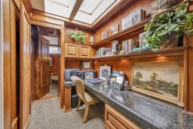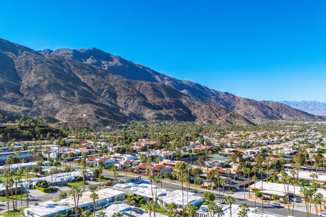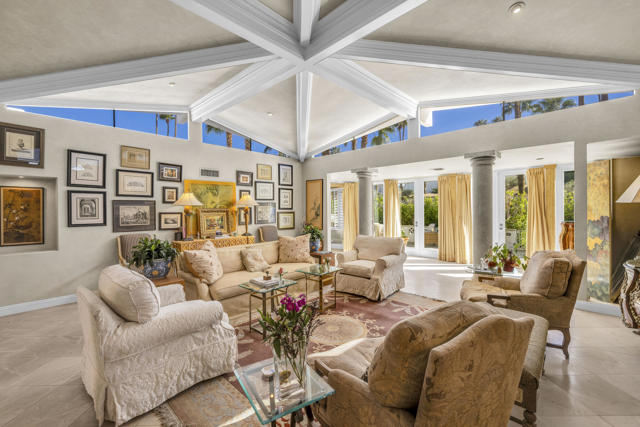 Where Mid-Century Modern meets Neoclassical design. This remarkable residence, located in the sought-after Canyon View Estates of South Palm Springs, is truly one-of-a-kind. Originally designed by famed architect William Krisel, the home features his iconic pop-up umbrella rooflines and clerestory windows, both hallmarks of a visionary who helped shape the Palm Springs modernist movement.The interiors showcase a stunning expression of neoclassical elegance. Hand-cut French limestone floors, laid on the diagonal from front to back, anchor the living spaces. Dramatic Mahogany beamed ceilings finished with gold leaf. Custom millwork includes raised and recessed matching-grain mahogany paneling in the dining room and second bedroom/den, walnut paneling in the third bedroom, and boxed-hinged cabinetry in the kitchen. The primary bathroom is appointed with filled travertine tile with black onyx inserts, and granite counters. Hidden doors and moving bookshelves create secret passageways, blending architectural surprise with function. The second bedroom is used as a den with a Murphy bed. The house has a newer hot water heater (2023) and a recoated roof (2025).Designed for both style and comfort, the residence offers an easy flow between living, dining, and entertaining areas, enhanced by abundant natural light. Canyon View Estates provides a serene desert setting with mountain views, community pools, and the architectural pedigree that has made the neighborhood one of Palm Springs' most celebrated. The community was recently used as the location for the feature film Don't Worry Darling.