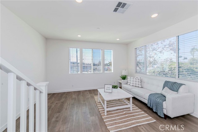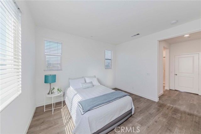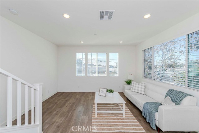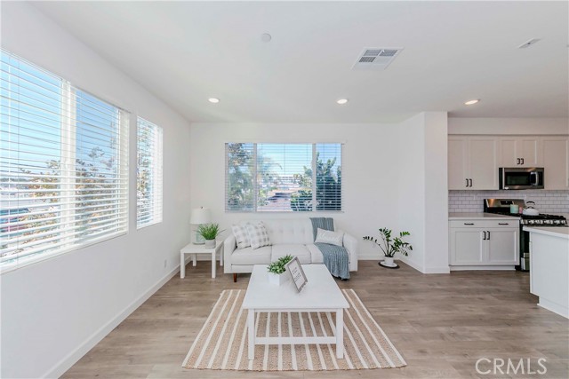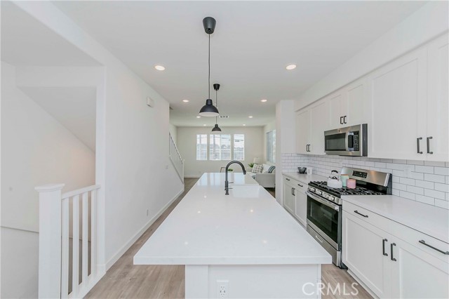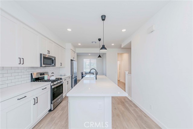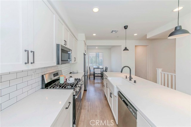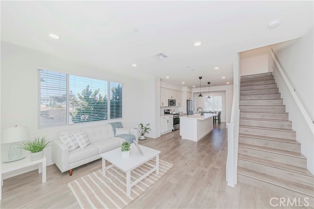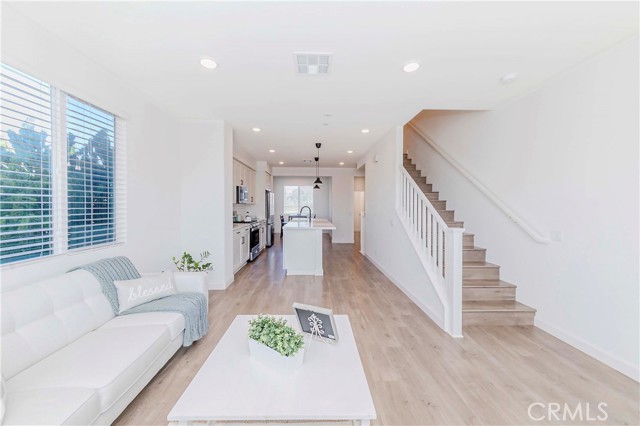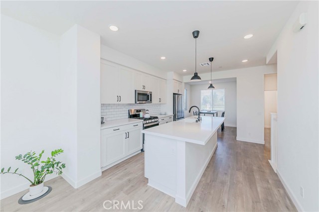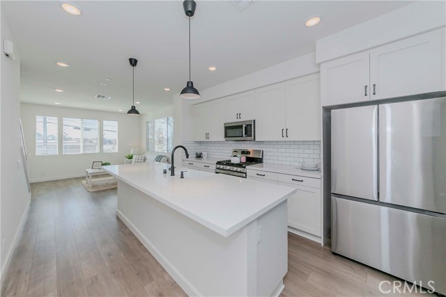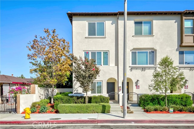 Welcome to this stunning contemporary townhome in the highly sought-after Flora Walk Community! Built in 2021, this bright end-unit home offers 3 bedrooms and 3.5 bathrooms with a modern, stylish design and meticulous attention to detail throughout. The open-concept living area is filled with natural light and features elegant laminate wood flooring. The gourmet kitchen boasts a spacious Quartz countertop island and premium stainless steel appliances — perfect for both everyday living and entertaining. A bedroom with a full bathroom is conveniently located on the first floor, ideal for guests or a home office. Upstairs, the primary suite offers a walk-in closet, dual sinks, and a beautiful shower. The third en-suite bedroom also includes its own private bathroom. The laundry area with stackable units and extra storage is located on the same floor for added convenience. Additional features include recessed lighting, a tankless water heater, central A/C & heating, a 2-car side-by-side garage with direct access, and an EV charging station. HOA due $284/month. Community amenities include a fire pit, BBQ area, pet area, gated entrance, and ample guest parking. Convenient location! Close to schools, freeways, shopping, and dining. Don't miss out on this beautiful home!