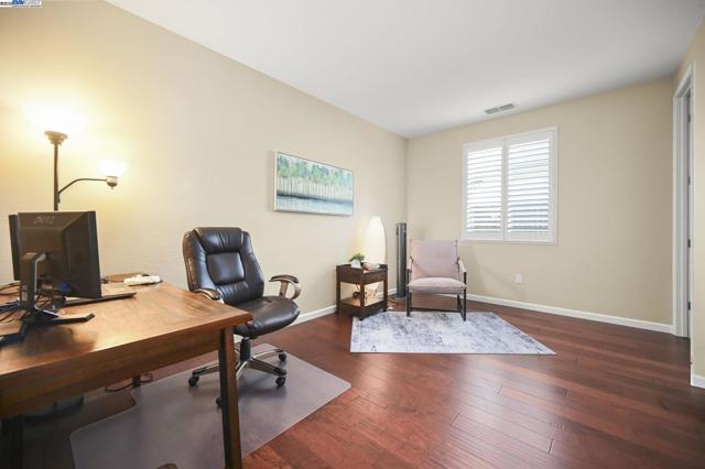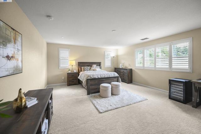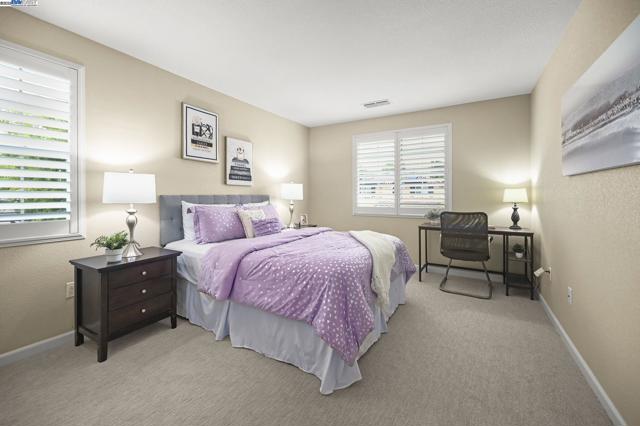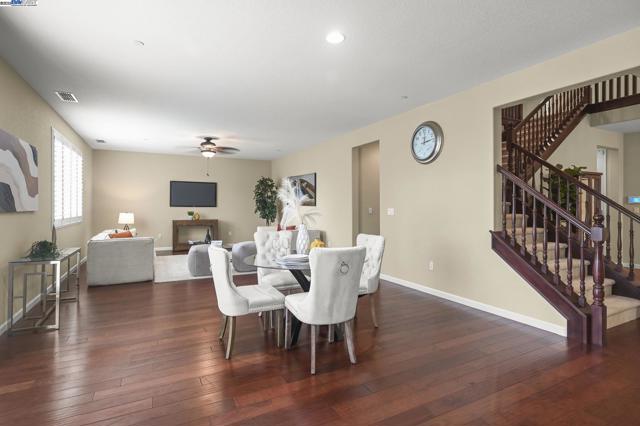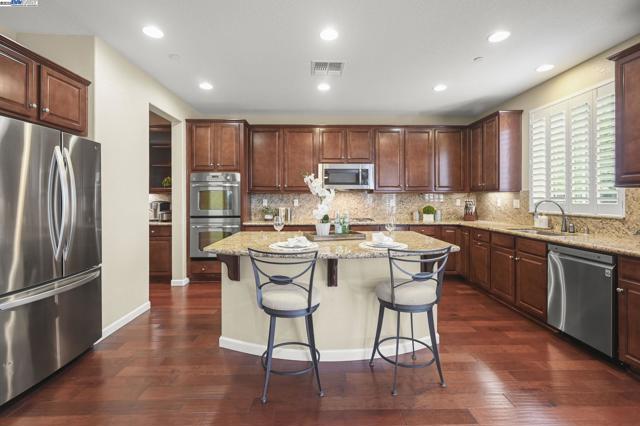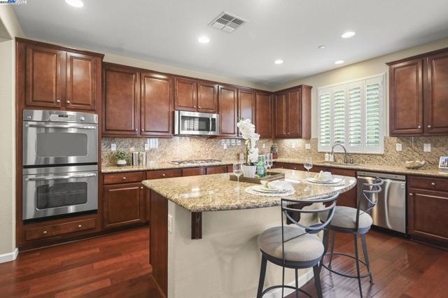Stunning, high-upgrade single-family home with luxury finishes. This immaculate 5-beds, 3-bath residence spans ~3,477 sq ft and includes an attached 3-car garage. A full bedroom and bath on the 1st floor adds versatility for guests, a home office, or multi-generational living. A large loft on the 2nd floor provides additional flexible living space for gathering, a home gym or quiet retreat. The 1st floor features pristine hardwoods, while the 2nd floor has plush upgraded carpeting. All bathrooms boast stylish tile flooring, adding durability and a polished, cohesive look throughout the home. The chef-inspired kitchen shines with stainless steel appliances, abundant upgraded cabinets, granite countertops and backsplash, island, pantry, double ovens, a new gas stove, and a refreshed faucet. Laundry with washer/dryer, sink, and built-in cabinets enhances convenience. The spacious primary suite offers a spa-like bath with dual vanities, a separate tub and shower, and a large walk-in closet. Step outside to a beautifully landscaped backyard with manicured lawns, pavers, and no rear neighbors for privacy. Upgraded solar power and no HOA dues add energy efficiency and ease of ownership. This turnkey home blends luxury, functionality, and value, ready for you to move in and enjoy.
