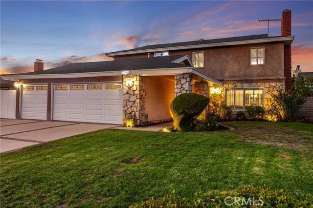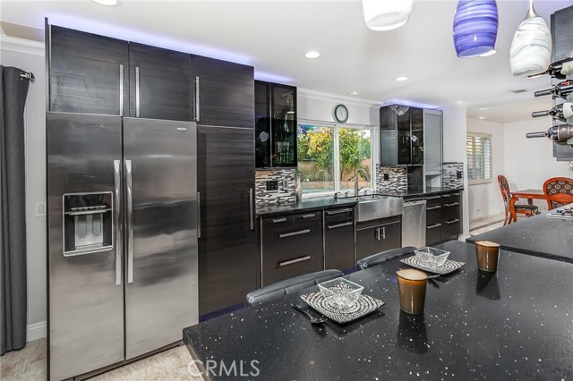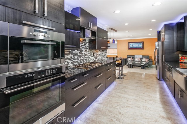 Set on a quiet CUL-DE-SAC, this upgraded entertainer’s POOL home combines style, comfort, and luxury with striking curb appeal. Bonus: GATED RV ACCESS - that opens to the backyard - and can accommodate up to 55 ft. of parking space, and a three-car direct-access garage with an extra-wide 4-car driveway. Manicured hedges, vibrant flowerbeds, and a covered portico welcome you to a residence designed to impress. Inside, the dramatic step-down living room features soaring ceilings, expansive windows with plantation shutters, a floor-to-ceiling stone fireplace, and polished MARBLE tile floors, creating a bright, open space perfect for gatherings. The remodeled kitchen is a chef’s showcase with recessed and accent lighting, rich cabinetry with space efficient pull-out drawers, quartz countertops, custom tile backsplash, farmhouse basin, and top-of-the-line stainless steel appliances—including Bosch® 5-burner gas range, built-in oven and microwave, LG® dishwasher, and refrigerator. A quartz-topped high table with pendant lighting completes the space for casual dining. The dining room features a large picture window, plantation shutters, and statement chandelier. The family room offers crown molding, recessed lighting, warm wood laminate floors, and sliding French doors opening to the backyard. A convenient guest powder room rounds out the main level. The primary suite is a serene retreat with soaring ceilings, plantation-shuttered windows, stone fireplace, two closets (including walk-in), and new carpet. The en suite bathroom includes a new quartz crowned vanity with dual sinks in a dedicated vanity area and a private glass-enclosed shower. Three additional bedrooms are bright and spacious with ample closet space and new carpeting. The fully remodeled guest bathroom includes a quartz topped vanity with dual basins, oversized mirror, multicolor accent lighting, and a glass-enclosed tub/shower. Additional highlights: laundry room, Smart thermostat, central air and heat, smart exterior multi-color lighting illuminating the front and garage—perfect for entertaining, and fresh interior paint enhances the majority of the home. The backyard is an entertainer’s paradise with sparkling in-ground pool, open patio, lush greenery, colorful raised planters with décor lighting, and garden shed. Minutes from Westfield Topanga, The Village outdoor mall, premier shopping, and dining, this home offers an elevated Southern California lifestyle.