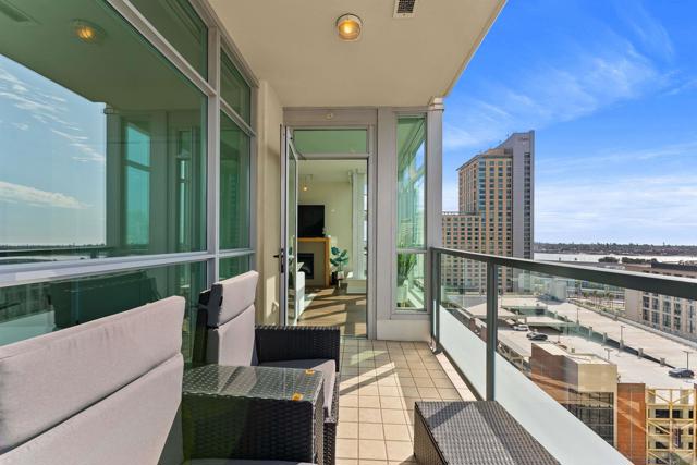 Welcome to Unit 1507 at The Legend, where downtown San Diego living reaches new heights. This exceptional two-bedroom, two-bath corner residence combines modern luxury with unbeatable convenience in one of East Village's most sought-after addresses. Natural light pours through floor-to-ceiling windows adorned with custom treatments, illuminating beautiful hardwood floors and highlighting the home's thoughtful design. The gourmet kitchen impresses with granite countertops, premium cabinetry, decorative tile backsplash, and top-of-the-line stainless appliances—ideal for both everyday meals and entertaining. Your private balcony showcases captivating western views, creating the perfect backdrop for morning coffee or evening wine as you watch the sun dip below the horizon. The generous primary bedroom offers a serene escape with an oversized walk-in closet and luxurious ensuite bath featuring double sinks and elegant tile finishes. Practical luxury continues with climate-controlled comfort, two dedicated parking spaces, and additional storage space. The Legend's resort-caliber amenities are truly exceptional: take a dip in the sparkling pool, unwind in the spa, steam room, or sauna, and stay fit in the state-of-the-art gym. The spectacular rooftop deck features fire pits, grilling stations, and a full kitchen with stunning Petco Park views. Plus, enjoy private 7th floor deck access—perfect for catching Padres games and concerts right from home. Location doesn't get better—walk to Petco Park, explore trendy restaurants and coffee shops, or enjoy quick access to Balboa Park!