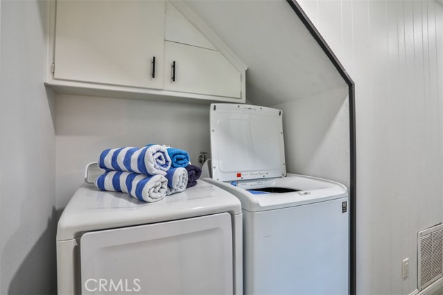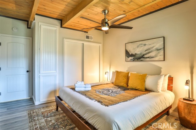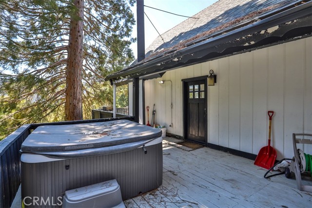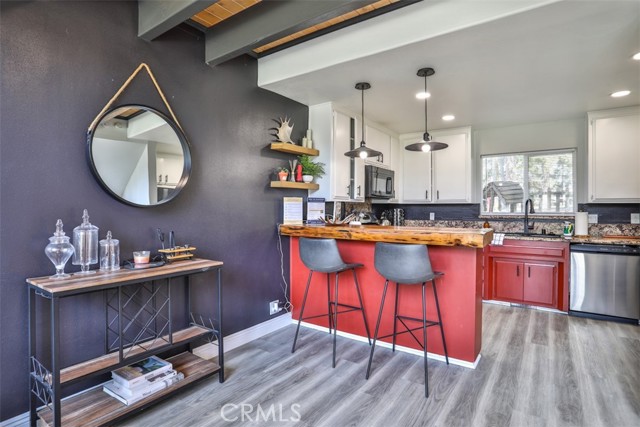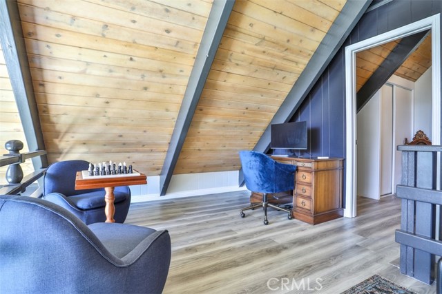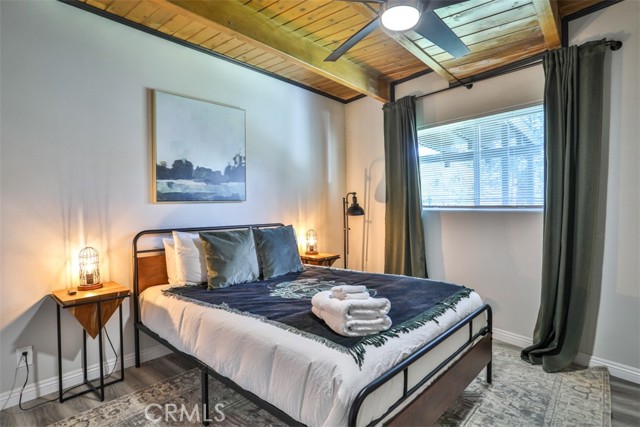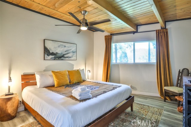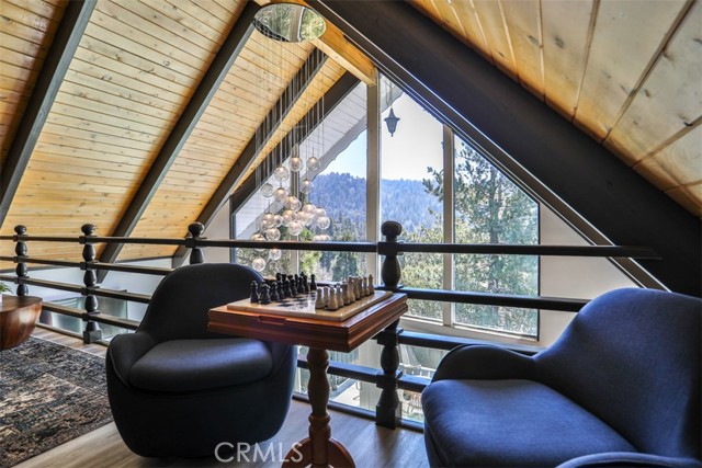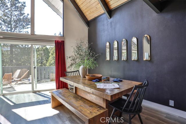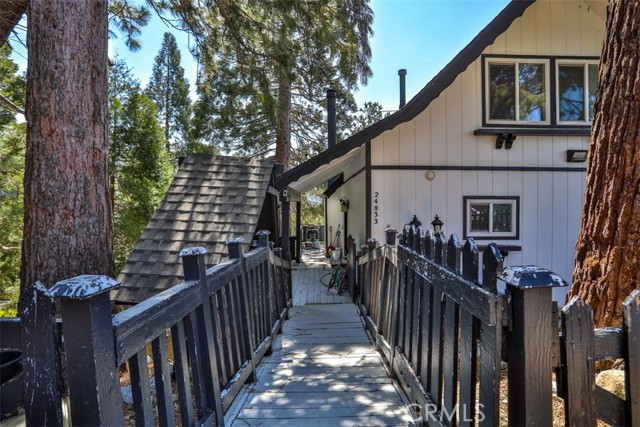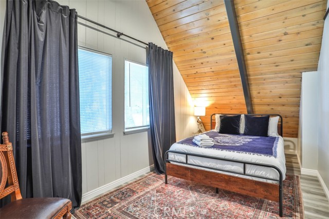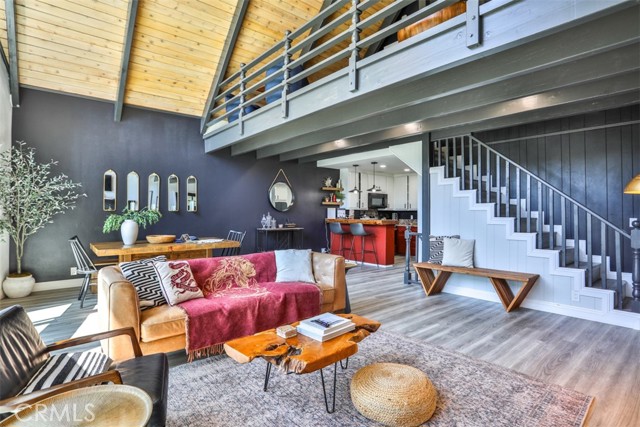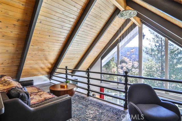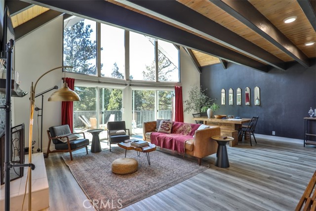 Escape to the serene, alpine beauty of Crestline with this charming A-frame cabin that blends classic architecture and modern comforts. Nestled less than a mile from the picturesque Lake Gregory, adventure awaits with hiking trails like Crestline Canyon, Heart Rock, and Strawberry Peak nearby. Step inside to the soul-inspiring living room with soaring, two-story vaulted ceilings adorned with natural wood and open beams, creating a warm and inviting ambiance. Awash in natural light from two-story windows framing stunning mountain views, the living room offers a perfect retreat to unwind and make memories. Enjoy cooking up a great meal in the upgraded kitchen, featuring granite counters, custom tile backsplash, and pendant lights over the breakfast bar. Central heating, ceiling fans in each bedroom, and dual-pane windows ensure year-round comfort, while the cozy fireplace beckons for relaxing evenings. Fully remodeled with laminate flooring and custom lighting throughout, this retreat is move-in ready. The upstairs loft offers a second, cozier living space with a beautiful view and a cathedral-ceilinged bedroom. Downstairs, you’ll find three additional bedrooms, a fully remodeled bathroom, and the washer and dryer. One of the bedrooms does have a closet and is currently used as a game/storage room. Relish in evergreen, mountain vistas from the wraparound deck, perfect for stargazing or savoring your morning coffee. With Lake Gregory less than a mile away, enjoy fishing, boating, or a leisurely stroll along the scenic trail. Crestline's shops and restaurants are less than two miles away. Looking for a turnkey combination investment and vacation home? This one is already registered for short-term rental (Airbnb/VRBO). The designer furnishings are available for separate purchase, allowing you to effortlessly get started. On top of all that, the electrical panel has been upgraded to 200 amps with load-balancing, and the water heater is new. Don't miss the chance to make memories in this mountain oasis, tucked within the tranquil surroundings of San Bernardino National Forest. Be sure to check out the video and 3D tour, and welcome home!