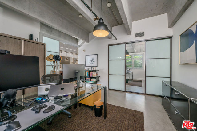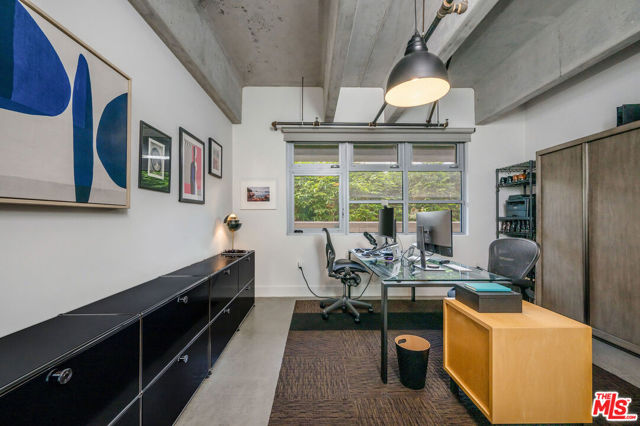 Experience true loft living in this one-of-a-kind residence at Element, a design-forward building featured in The New York Times and L.A. Architect Magazine for its distinctive concrete and steel construction, 11-foot ceilings, and exposed concrete beams. This industrial-style space is softened by designer finishes, offering a refined, creative living environment. This expansive, south-facing 1,540 SF unit features polished concrete floors, updated lighting, custom zebra wood cabinetry and closets, ripple fold drapery, and motorized light-filtering shades. Floor-to-ceiling aluminum-framed windows and Fleetwood sliding glass doors lead to a double-width private balcony, seamlessly blending indoor and outdoor living. The oversized 13' Carrara marble island with soft-close drawers, bar seating, built-in pantry, Viking Professional appliances, Brizo faucet, double-bowl sink, and wine fridge anchor the chef's kitchen, ideal for entertaining. The spa-like bath includes a double vanity, soaking tub, walk-in shower with dual shower heads, and custom linen cabinet. Note: This unit does not have enclosed bedrooms, offering a fully open floor plan perfect for creative customization. Additional Features: *Two parking spaces (tandem) with EV charger *Ample guest parking *Secure access, fitness center, bike storage *Community courtyard with fire pit and grill *Well-managed building with strong reserves. Located in the heart of the Marina Arts District with a Location Score of 92, just minutes from shops, restaurants, theaters, the beach, and marina. Don't miss this rare opportunity to live in one of the Westside's most architecturally distinctive and vibrant communities.