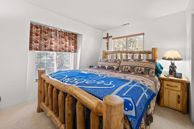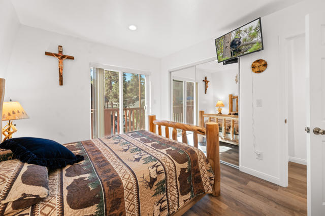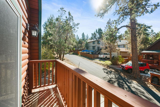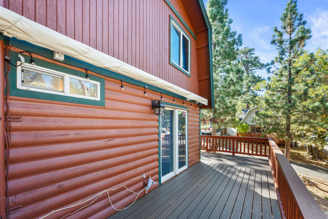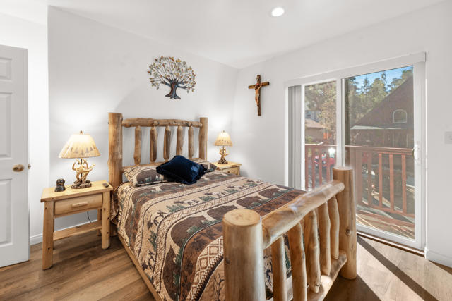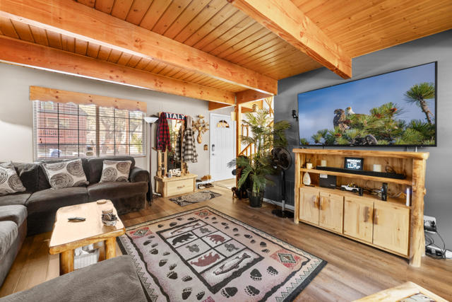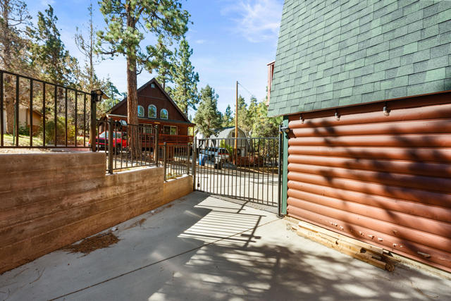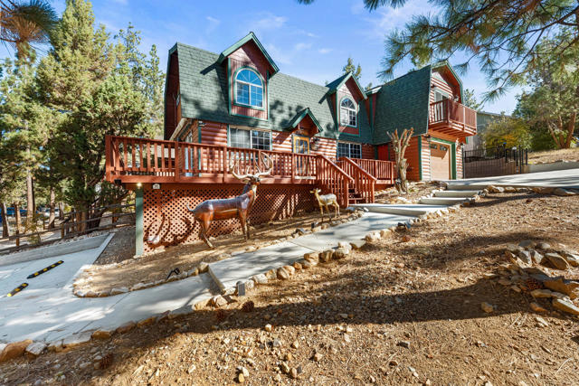 Charming log-sided gambrel-style cabin in Sugarloaf offering an incredible amount of space and flexibility! This well-maintained 5-bedroom, 3-bath home includes a unique bonus -- a separate living area with private entry, two bedrooms, one bath, and its own gated off-street parking, perfect for guests or extended family. Situated on a desirable corner lot with xeriscape landscaping and plenty of concrete parking, plus an oversized one-car garage for extra storage or workshop potential. Enjoy Big Bear's mountain air from the multi-level decking that's ideal for outdoor dining and entertaining. Inside, you'll find a bright and inviting interior with laminate flooring, dual-pane windows, and central forced-air heat and A/C for year-round comfort. The comfortable living room features a river rock wood-burning fireplace for cozy winter nights, and the upgraded kitchen and baths add modern comfort while maintaining mountain charm. This property is loaded with valuable upgrades -- including a paid-for solar system with battery backup and a newer roof (2020). Turnkey and move-in ready, this cabin combines rustic appeal with energy efficiency and modern convenience. Whether you're looking for a full-time residence, multi-generational retreat, or investment property, this Sugarloaf gem checks every box.