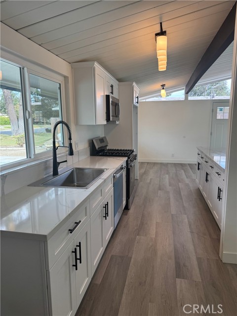 Beautifully Remodeled Mid-Century Modern Home in La Habra! This stunning 3-bedroom, 2-bath home has been completely remodeled inside and out. Enjoy a brand-new driveway with generous parking space for multiple vehicles, plus a spacious backyard with fresh concrete and a sparkling in-ground pool—a perfect setting for barbecues, celebrations, or quiet evenings by the pool. The pool was recently replastered with pebble finish and new filter, new pump, and new lights were installed. The bright, open kitchen features elegant quartz countertops, a new island overlooking the family room, all-new stainless steel appliances including gas stove, microwave, and dishwasher, plus a new sink and fixtures. Throughout the home, you’ll find new flooring, fresh interior and exterior paint, recessed lighting, and double-pane windows for energy efficiency and comfort. Both bathrooms have been beautifully upgraded with new vanities, quartz countertops, new toilets, shower doors, mirrors, and modern lighting. The detached two-car garage includes a new motor and door. Potential RV parking at side of home. Located on a quiet street in the City of La Habra, close to restaurants, shopping, banks, and schools. This move-in-ready Mid-Century Modern home blends timeless style with today’s upgrades—an ideal home for both relaxing and entertaining!