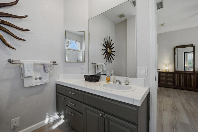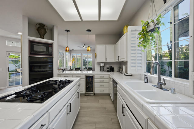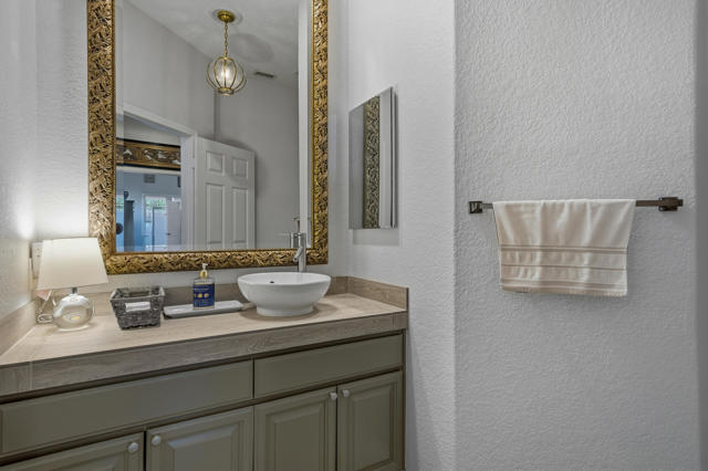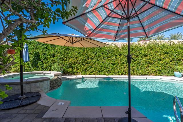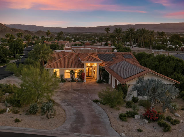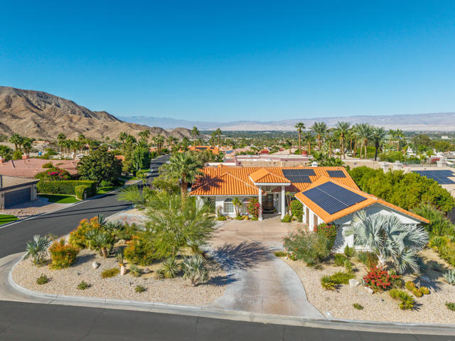 Perched on a premium corner lot in the gated hillside enclave of Vista Paseo, this custom built solar home offers exceptional privacy, energy efficiency, and desert living at its finest. It's the only home in the neighborhood with a circular driveway - an elegant touch that sets it apart. Just moments from scenic hiking trails, public tennis and pickleball courts, and the world class shopping of El Paseo, this South Palm Desert gem combines location with lifestyle. Spanning 2,790 square feet on nearly 16,000 square feet of land, the home features three spacious bedrooms - each with its own ensuite bath - a formal living and dining area with pool views, a bright and airy island kitchen, and a relaxed family room perfect for gatherings. The oversized three car garage offers ample storage and flexibility. The backyard features a beautifully finished Pebble Tec pool with new lighting and three tranquil water features. Multiple patios offer both shaded dining and lounging areas with dramatic mountain views and ultimate privacy. Recent upgrades include a high efficiency solar system with backup battery system, new luxury flooring in much of the home, a stunning $7,000 builtin refrigerator. and more. Built in 1995 - decades newer than most South Palm Desert homes in this price range - this property stands out for its modern construction, curb appeal and unbeatable value. And with low HOA dues of just $140/month, its one of the best priced homes in the area with a three car garage. Don't miss this unique opportunity to own a stand-out property in one of South Palm Desert's most desired communities.
