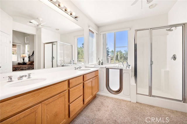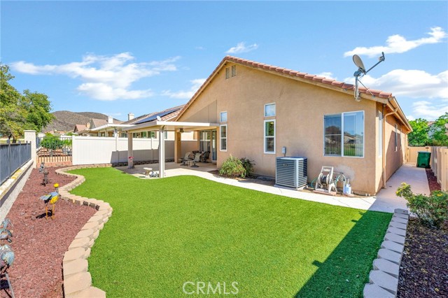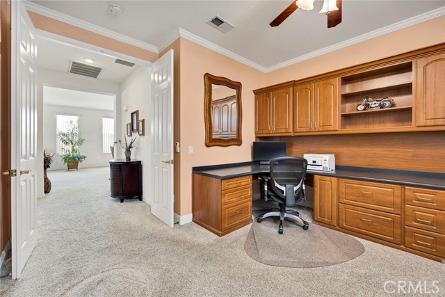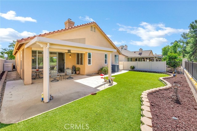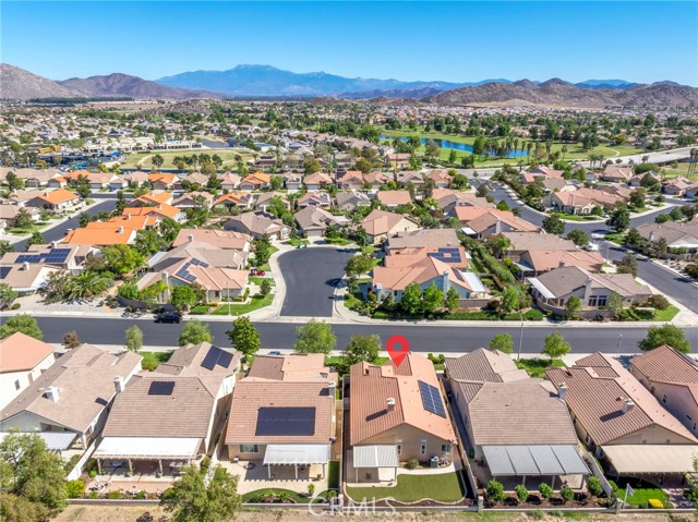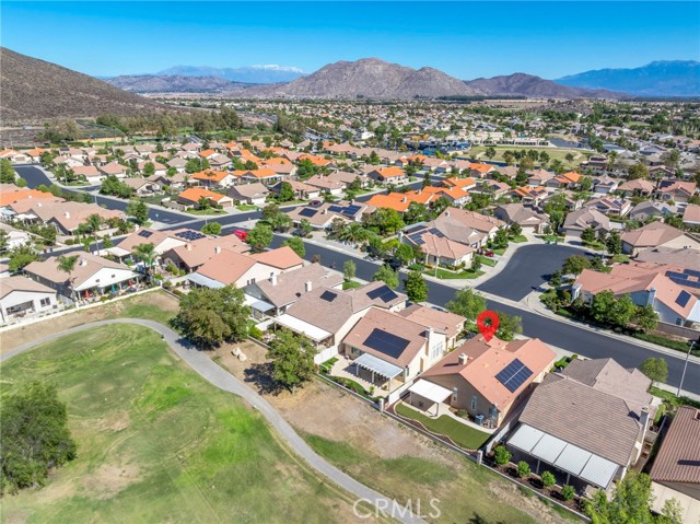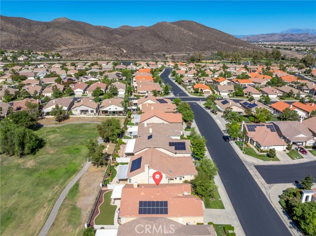 This beautifully maintained single-story home is located directly on the Golf Course in the highly sought-after 55+ Resort-Style Community known as “The Oasis”. This all-electric, energy-efficient residence combines comfort and functionality with an owned solar system, newer air conditioning installed in 2018, and a Quiet-Cool whole-house fan for maximum energy efficiency. Inside, you’ll find tall ceilings, crown molding, sun-screens, and ceiling fans throughout, creating a bright and comfortable living space. The open-concept layout features a spacious Great Room with a tile fireplace and built-in office area, ideal for working from home or managing hobbies. The Home Office could also be used as a 3rd Bedroom if needed. The eat-in kitchen offers ample cabinetry, generous counter space, and an inviting casual dining area perfect for everyday meals. The Master Bedroom suite provides a peaceful retreat with a large walk-in closet and an upgraded walk-in soaking tub installed in December 2023. The laundry room includes tile flooring, a utility sink, and extra storage. Step outside to enjoy low-maintenance landscaping with artificial turf, stamped concrete, and an alumawood patio cover with ceiling fan, overlooking the lush golf course with gorgeous mountain views. Additional highlights include an insulated garage door with built-in cabinets, a water softener, and a water heater blanket. The Guard-Gated community of Oasis offers resort-style amenities including a 22,000 sq. ft. clubhouse, pool, spa, fitness center, pickleball courts, bocce ball and a full schedule of social events and activities! The monthly HOA includes front yard maintenance and landscaping, water and trash service. The Oasis is conveniently located near shopping, dining, medical facilities, freeway access and just a short drive to the well-known Temecula Valley Wineries and Southern California Beaches, Desert, and Mountain destinations. This property truly offers it all…style, location, community amenities and functionality!