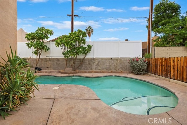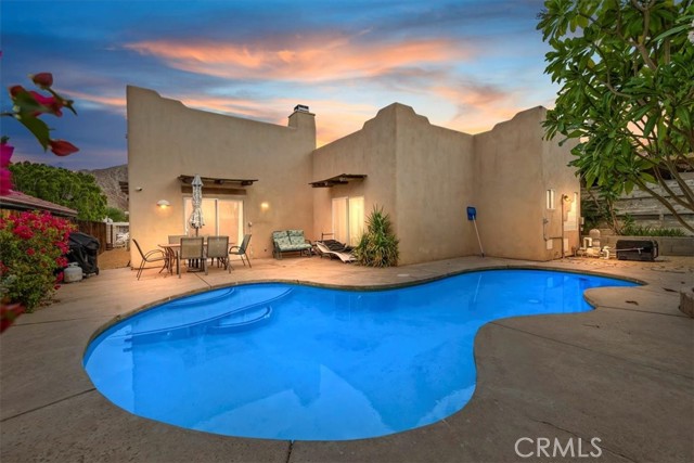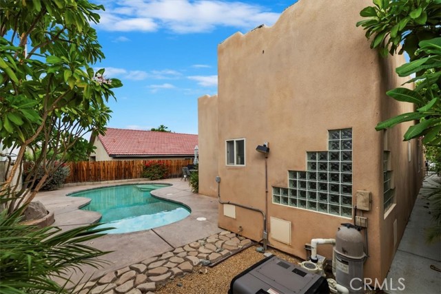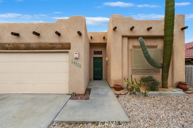 Desert living that won’t break the bank! This single-story Santa Fe-style home is located in the highly desirable La Quinta Cove, just minutes from Old Town La Quinta’s shops and dining, close to scenic walking and biking trails, and surrounded by world-class golf courses including PGA West and the La Quinta Resort & Club. Offering approximately 1,651 square feet of living space on a 4,792 square foot lot, this home features 3 bedrooms, 2 full bathrooms, and a 2-car attached garage with direct access to the interior. The backyard includes a heated in-ground pool—perfect for relaxing or entertaining. Inside, you'll find high ceilings and Spanish tile flooring that flows from the entryway into the kitchen, which opens to the family room and includes shelving and built-in cabinets. The kitchen offers ample counter space and cabinetry, a pantry for additional storage, a kitchen island with a wood butcher block top and second sink, black appliances, a full-size refrigerator (included), a breakfast counter bar, and a separate dining area with built-in glass display shelves and lower cabinetry. Two of the three bedrooms feature walk-in closets, and the laundry area is conveniently located inside, with a stack-able washer and dryer included. The large primary bedroom features built-in dresser nightstands, adding both character and function. The primary bathroom includes dual sinks, a tiled walk-in shower, and a jetted Jacuzzi tub—perfect for unwinding. Whether you're looking for a full-time residence, vacation home, or investment opportunity, this property offers an unbeatable location.
