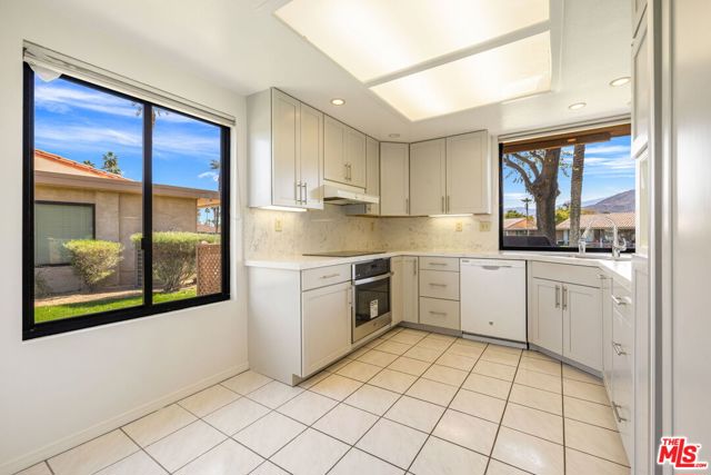 Sunrise Country Club is impeccably sited within its beautiful golf course community surrounded by panoramic mountain views, gated with 24 hour security in sought after Rancho Mirage. This 3 bedroom 2 bath end unit offers abundant natural light with an open concept great room with vaulted ceiling, featuring a spacious living room, dining with enclosed atrium featuring a wet bar, a covered terrace is accessible through wall of glass where lounging or outdoor dining enjoy link and fairway views. Additional features include an inside laundry room and an oversized garage with room for a golf cart and ample loft storage area. The architectural clubhouse includes a bar and grill, lounge, grand dining room with stunning lake and fairway views offering lunch and dinner, the club includes the 18-hole golf course, tennis and pickle ball courts, abundant swimming pools/spas and fitness center. Updates through the years include energy efficient dual glazed windows and Fleetwood slider. First class dining and shopping and medical are conveniently located within easy reach.