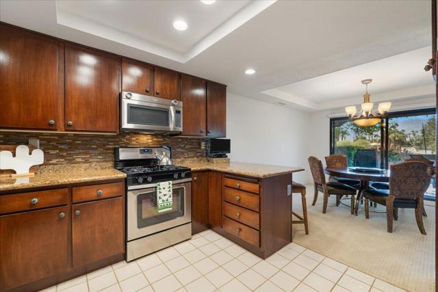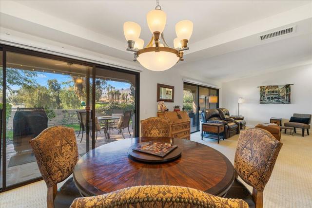 LOCATION, SOLAR & SPECTACULAR SOUTHERN VIEWS! This immaculate move in ready home combines spectacular panoramic southern mountain views with privacy and comfort. A highly upgraded Chaparral CC unit it has vaulted ceilings, tile floors with plush carpeting in the living/dining room and the 2 formal bedrooms. The 3rd bedroom has been converted to a den. This desert gem offers a beautiful kitchen with granite countertops, wood cabinetry, newer appliances and stainless-steel gas stove and microwave overlooking open living/dining area. Outdoor living & dining spaces are enjoyed on Saltillo covered patio with shade trees, more lush landscapes and mountain views. Each bathroom has been totally renovated with matching tile, large walk-in showers, gorgeous quartz counter tops and vanities, refinished ceilings and recessed lighting. No feature overlooked; upgraded window treatments throughout, low maintenance tiled atrium, custom ceiling fans in the den and bedrooms... PLUS PAID SOLAR! This home has it all - very bright, very inviting and very well appointed. Located in the heart of Palm Desert, Chaparral offers 18 holes of challenging golf, 21 pools & spas, tennis, pickle-ball, a fully equipped fitness room, activity center, pool and card tables and a remodeled clubhouse with world-class dining and entertainment