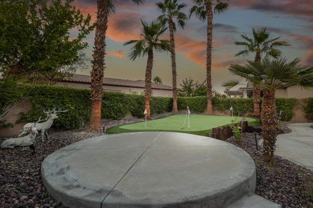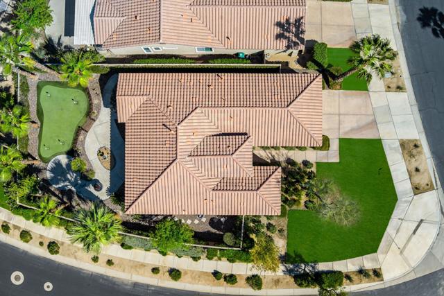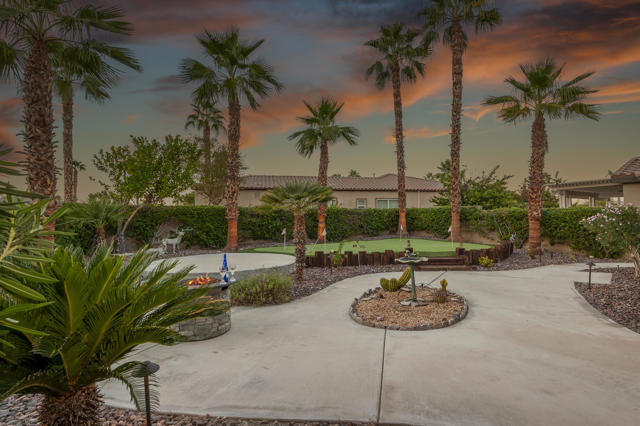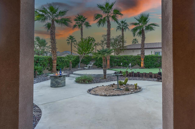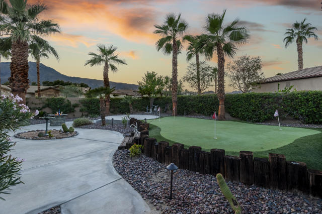 Life Well-Played! Big SW Mountain views, raised putting green, firepit, and patio dining in the round, make this home the perfect desert getaway. Located at Trilogy at La Quinta, this delightful 1,386 SQ FT Maurea model, two-bedroom, two baths home sets back off the street and is bright, cheerful and all you need to enjoy Trilogy's sublime golf and resort lifestyle. A recently added A/C and hot water heater, stainless range, new refrigerator and microwave have the heart of this home beating strong. The home rests on a slightly raised oversized 10,000+ SQ FT corner lot offering glorious Southwest sunset views from the front, side, and backyards. An open concept home, the nine-foot ceilings and big picture windows make it feel much larger. Outfitted with smooth tile floors, ceiling fans, and custom pull down solar shades the home offers cool comfort year-round. The kitchen is roomy with slab granite countertops and breakfast counter with seating for four. Ample wood cabinets, above and those below with pull-out drawers, and a pantry has all your dinnerware, utensils, pots and pans, and groceries well-organized. Serve up formal dinners in the large dining area or step through the sliding doors for barbecue on the covered patio, or fireside under the moon and stars. The primary bedroom suite is spacious with big picture windows overlooking the private backyard. Walk out the door to the back patio for an early morning pick-me-up or a nightcap before retiring. The primary bath features double vanities and a walk-in shower with bench seat and walk-in closet. The guest bedroom is at the front of the separate from the primary bedroom, with a mirrored wall closet and nearby bath with a shower and tub. The garage has ample space for two vehicles plus golf cart, and room for bikes, and some storage. Trilogy at La Quinta is a 55+active adult community of 1,238 homes on over 500 acres, and home to the Trilogy Golf Club and Kitchen Ten Eleven Restaurant. A resort community, residents enjoy Tennis, Pickleball, Bocce, an indoor lap pool and outdoor pool with spa and cabanas, surrounded by the breathtaking Santa Rosa and Coral Mountains. Exercise at the fitness center, join Zumba, Spin, and strength training classes, lift weights and run laps on the indoor track or on a treadmill. Clubs of every type and weekly entertainment keep the place humming with excitement.