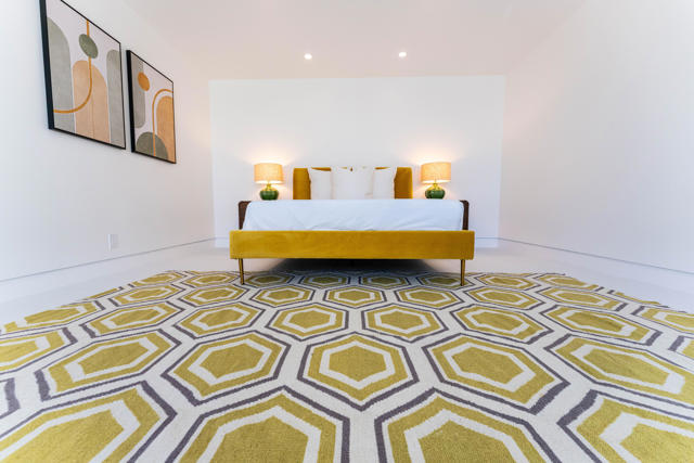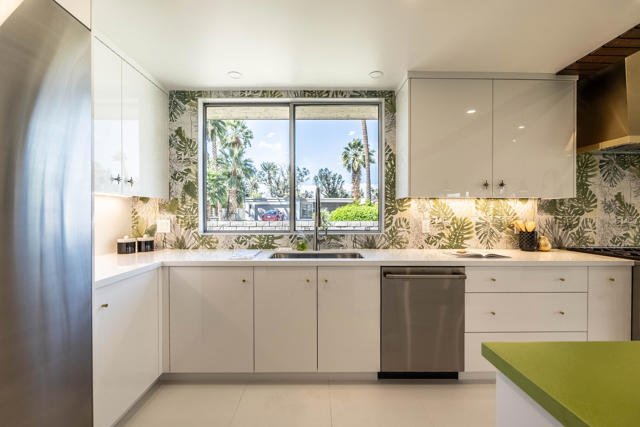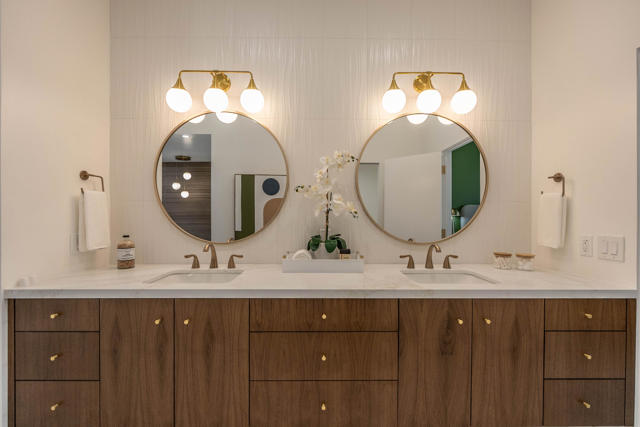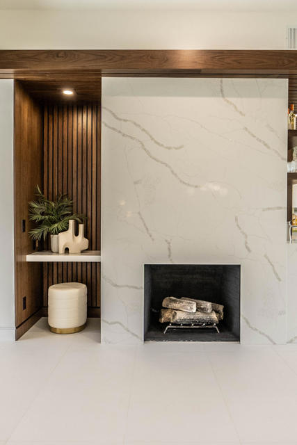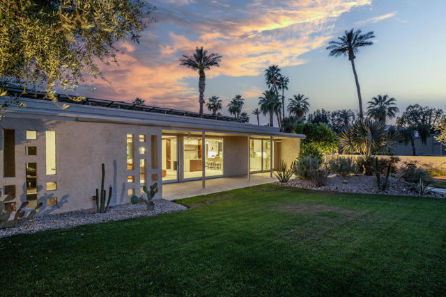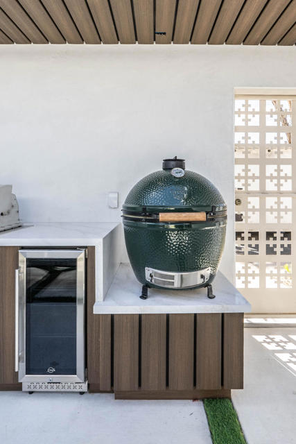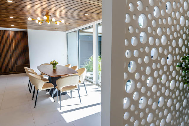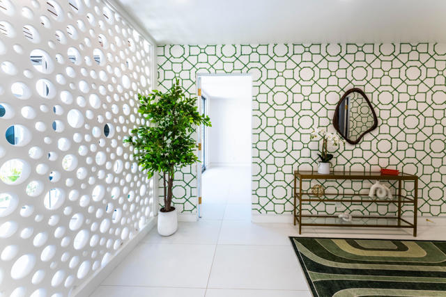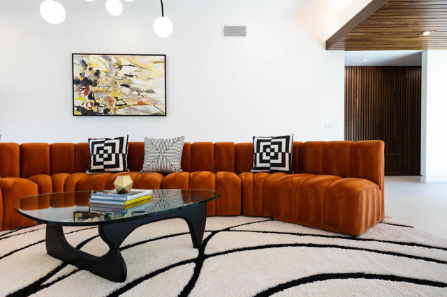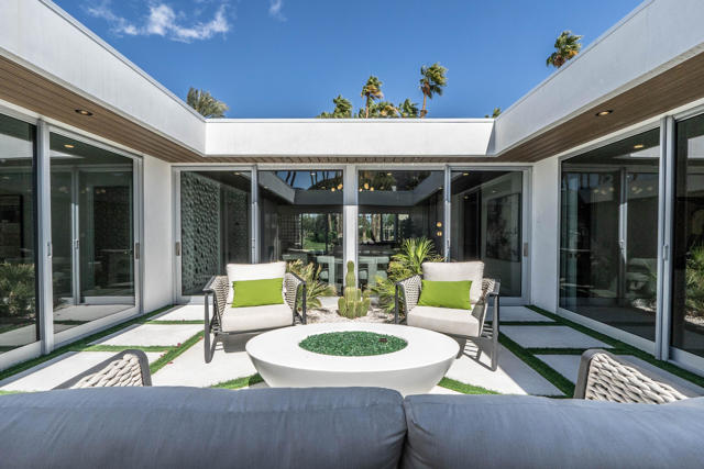 Mid-century enthusiasts, have your cake and eat it too! Absolutely stunning, completely remodeled William Krisel original design villa located in the sought-after historical landmark of the Sandpiper Community within Indian Wells Country Club. This exquisite property has been thoroughly re-imagined, blending modern elegance and amenities while preserving its unique architectural history that embodies the charm of desert living. As you enter through the elegant double-door entry, you'll find yourself in a stunning foyer, complete with a custom-built accent wall that truly stands out. Step into the expansive great room with beautifully-crafted walnut wood-slat detailing & a quartz wall surrounding the fireplace & wet bar, creating a warm inviting atmosphere. The dining room is a masterpiece, framed beneath a suspended ceiling that highlights the same beautiful walnut detailing. The modern & elegant kitchen is a true chef's dream featuring a stainless-steel Dacor full-size individual refrigerator & freezer, along with a glass front wine refrigerator for your favorite vintages. A GE Monogram 6-burner gas range ensures you have all the tools you need to create culinary masterpieces. An oversized island adorned with a vibrant quartz counter top anchor the room, making the space both functional and stylish. Retreat to the spacious primary suite...a spa-like oasis features a walk-in shower, a relaxing Roman tub, oversized vanity adorned with quartz countertops plus custom lighting. A large walk-in closet offers ample storage space. Meticulously designed, this retreat is a perfect blend of opulence and functionality.2 additional en-suite bedrooms are equally spacious & luxurious offering large vanities plus walk-in shower with glass doors offering comfort and privacy for family or guests.At the heart of the home lies an inviting atrium patio, perfect for entertaining and relaxation featuring a built-in gas grill and outdoor kitchen! Natural light pours in, brightening the entire home creating a warm, welcoming atmosphere. Additional features include a 4-step water filtration system, solar energy panels, epoxy flooring in garage, nicely updated laundry room with utility sink, 2 on-demand hot water heaters, LED lighting, ALL New windows/sliders with phantom screens throughout and much MORE!