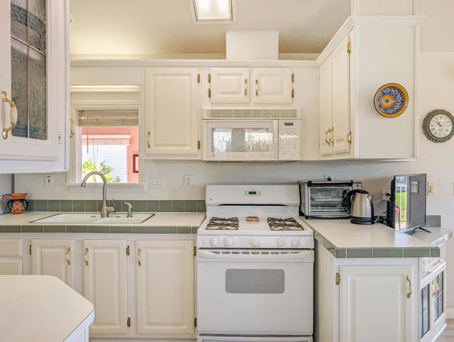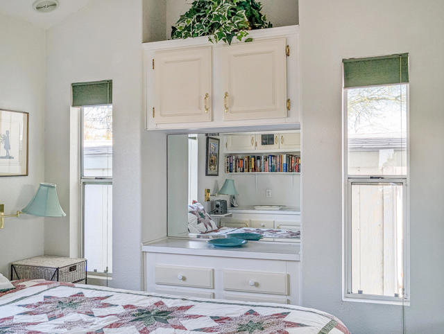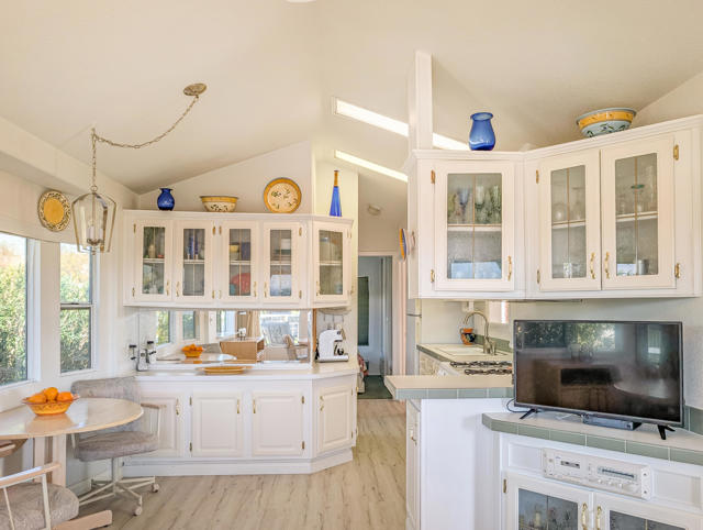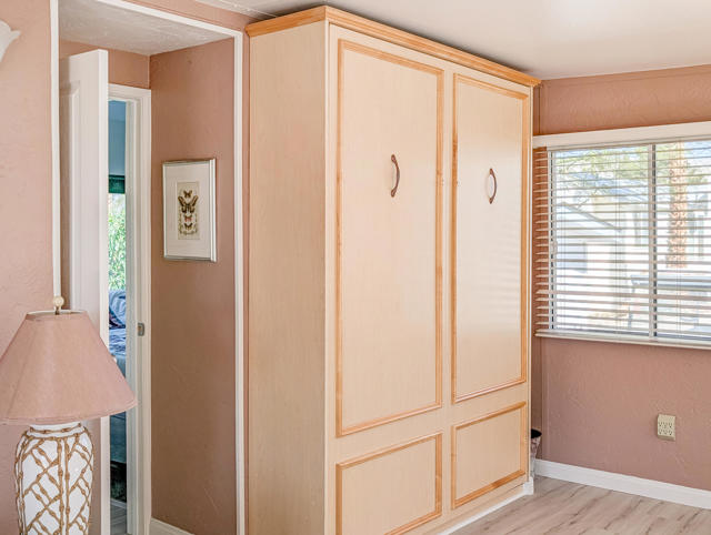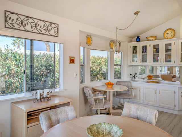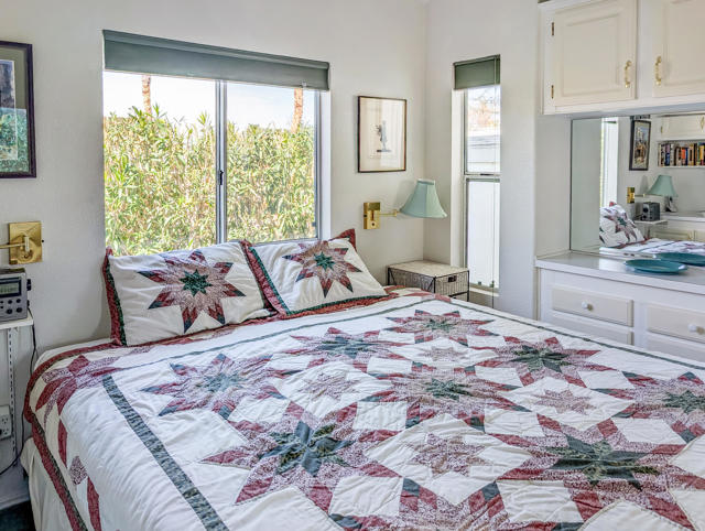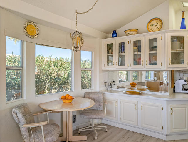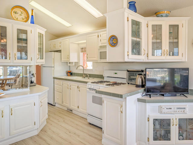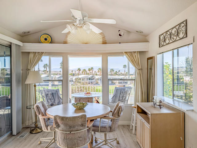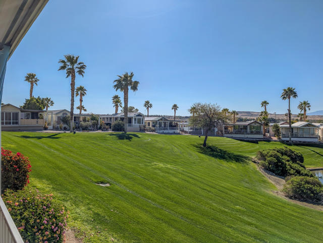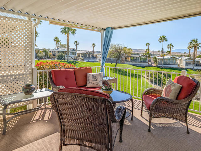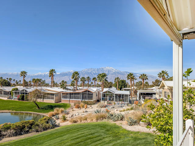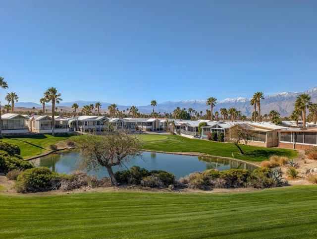 Situated high above the 9th hole on the golf course with views of Mt. San Jacinto, water features, and blue sky for miles this great 2000 Skyline Park Model awaits you! Here we have 1+ bedroom, 1 bath and many upgrades including new flooring, new carpet on back deck, king sized bedroom, 2nd sleeping area in California room equipped with a beautiful queen size murphy bed and the room has a door that closes off to main home for added privacy for guests. This well-appointed home is south facing and offers the most spectacular scenery from all around this unique place, here you can have a private and serene setting on the large, covered deck perfect for entertainment and on the inside of the home we have, a bright cheery decor and natural sunlight throughout make this an ideal getaway or permanent place to call home. Caliente Springs is a premier 55+ luxury resort with amenities that make you feel like a VIP, including a mineral-fed hot spring pool and spas, a 9-hole golf course, water ball, water aerobics classes, yoga, 8 pickleball courts, tennis courts, and much more in this lively and active community. The lot is not owned; space rent is $950. Comes with golf cart.