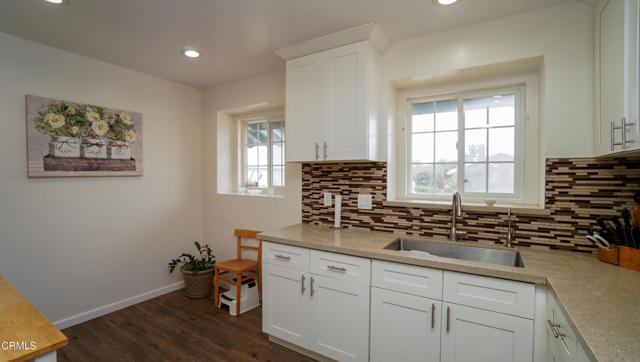 Great opportunity on this 4 bedroom, 2 bathroom, single story home for sale with an extended driveway and attached 2 car garage. Front entry leads in to the open living and dining rooms featuring a fireplace with mantle and floor to ceiling brick surround. The renovated kitchen includes recessed lighting, newer cabinetry, Quartz countertops, mosaic tile backsplash, stainless steel fixtures, stove/oven and laminate wood flooring. The spacious family room with exposed wood beams looks out to the backyard with avocado and other fruit trees. The main bedroom features dual closets, built-in shelving and drawers, along with a main en-suite bathroom with a large tile shower and mosaic accents. Down the hall are 3 additional bedrooms and a secondary bathroom with large tiled shower and mosaic accents. Additional features include a water softener and newer roof. Home is a short drive to shopping, nearby beaches and Channel Island Harbor.