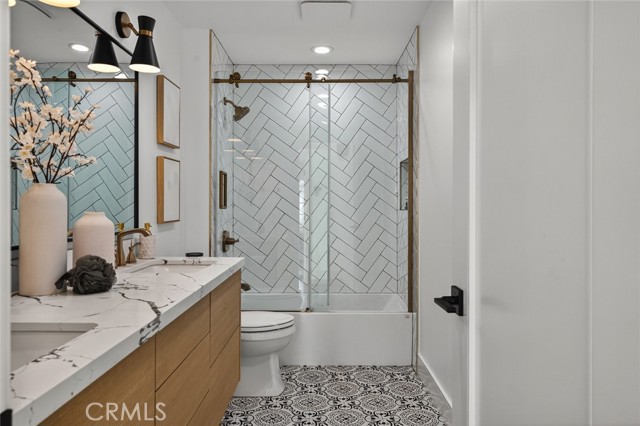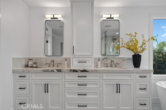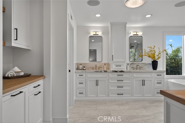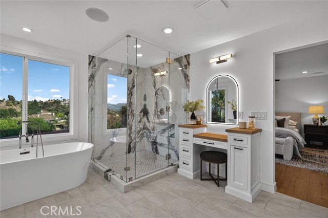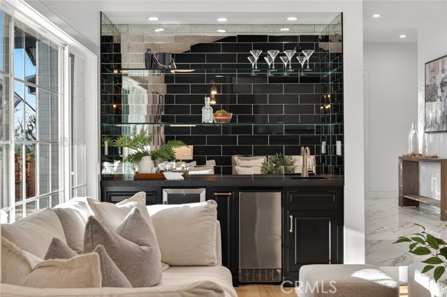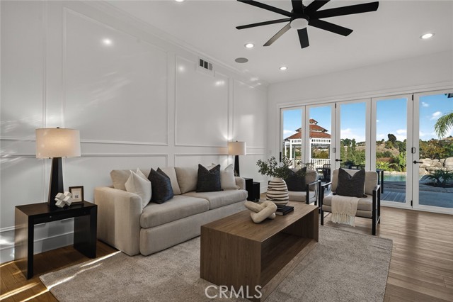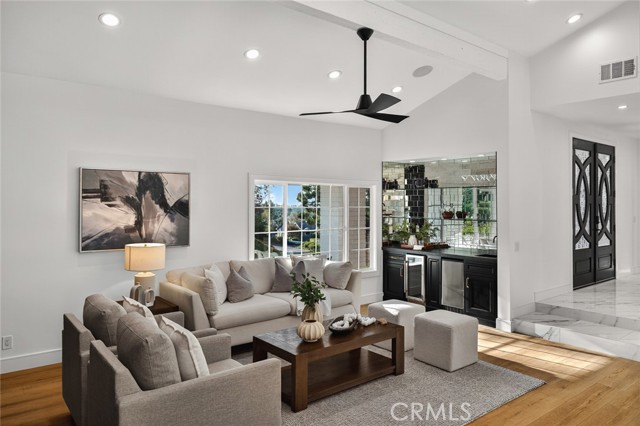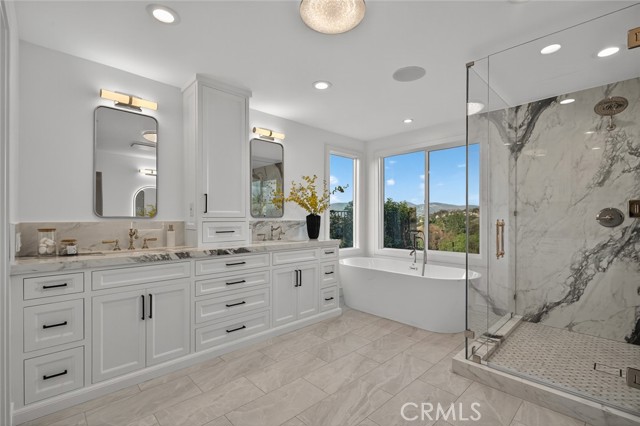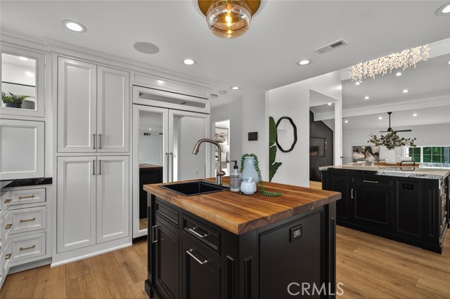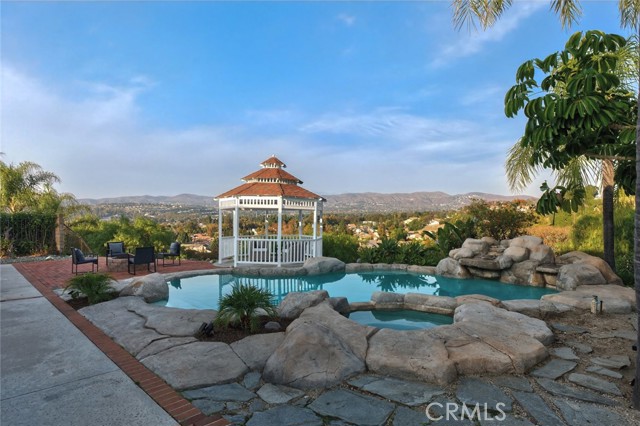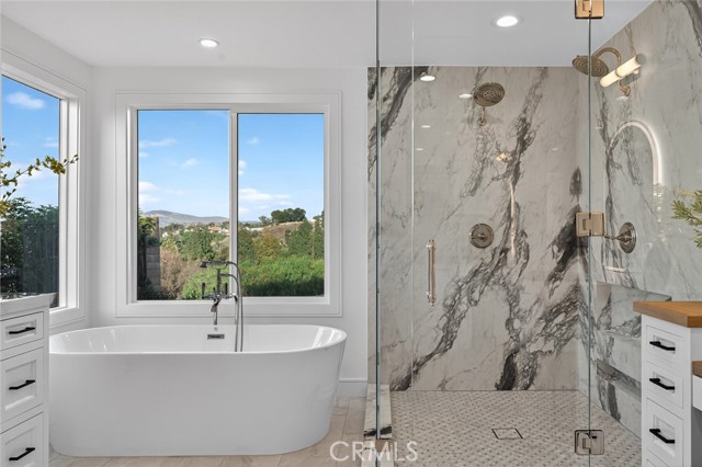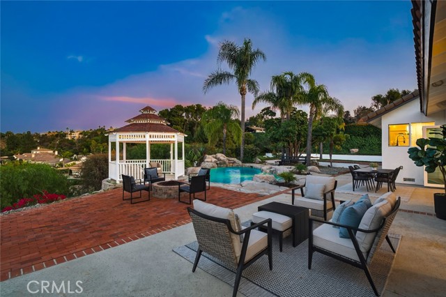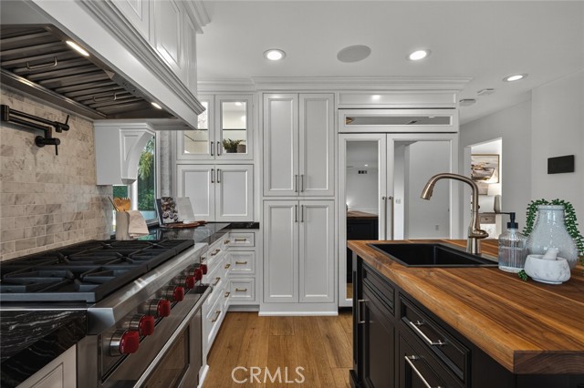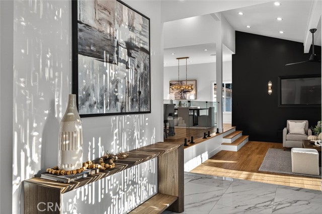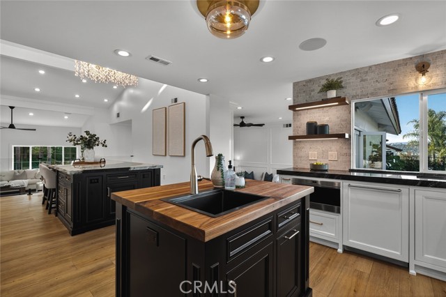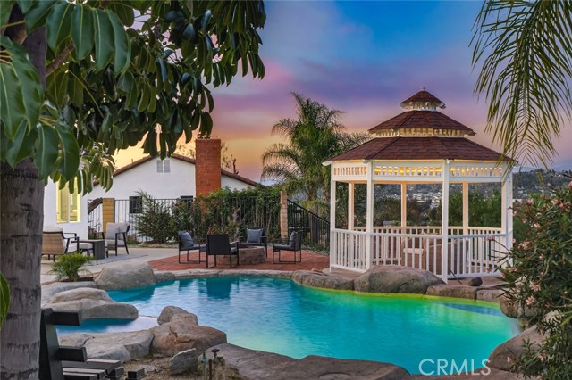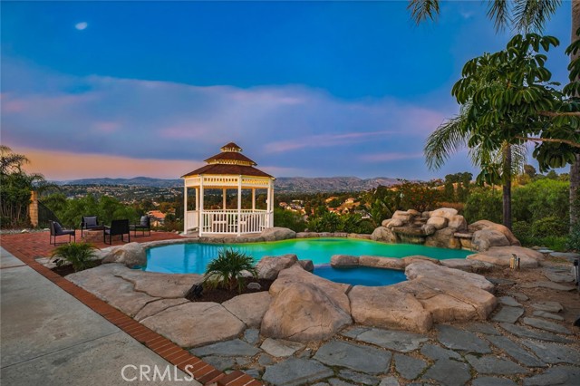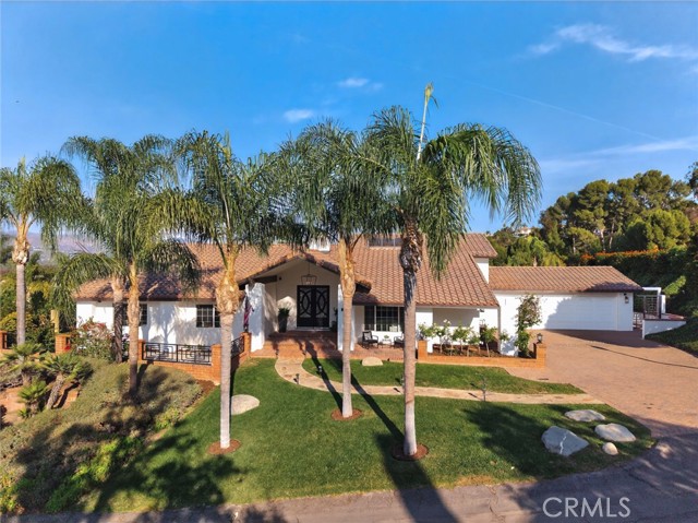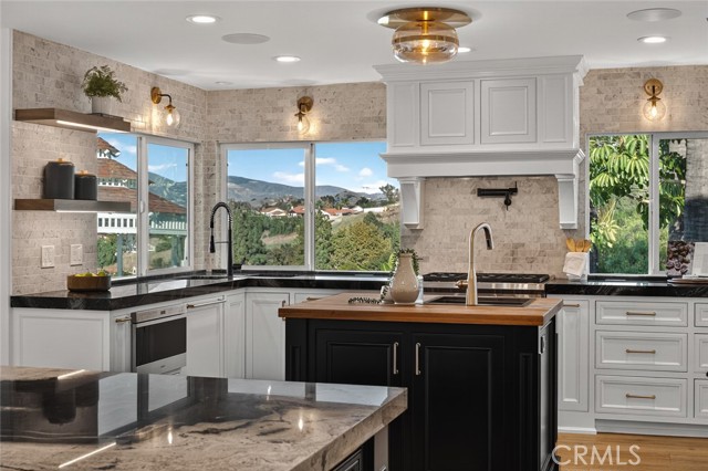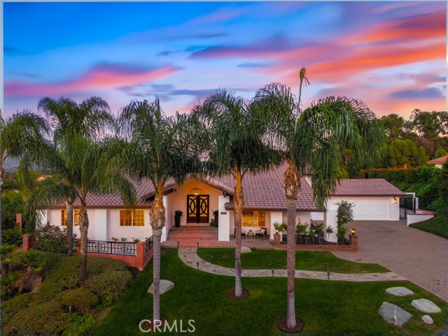Sophisticated Single-Level View Home in Anaheim Hills. Experience refined California living in this reimagined single-story residence where luxury design meets everyday comfort. Nestled in one of Anaheim Hills most desirable neighborhoods, this home blends timeless craftsmanship, modern innovation & resort-style living. Step through the mahogany solid-core double-door entry into a home defined by precision & detail. Seamless wood casings accentuate every opening, while Level 5 smooth-finish walls & ceilings create an elevated, gallery-like feel. Luxury vinyl wide-plank flooring flows throughout, complemented by recessed lighting, and dual-pane windows. Concertina doors in the family room open to the backyard, extending the living space to the beautifully scenic views. Modern upgrades include a new 200-amp electrical panel & Control4 smart home system. The kitchen & dining area showcase custom wood inset soft-close cabinetry with a lacquer finish, natural stone & solid walnut counters, Eurofase lighting, Sub-Zero refrigerator with custom panels, Wolf appliances, retractable pot filler, dual sinks with an option for a third, & a 12-foot island with seating & storage. The living & family rooms feature a wet bar with wine refrigerator, leather-finished natural stone, designer mirror tile & glass shelving. A glass partition separates the rooms, while the updated fireplace with wood paneling & leather-finished stone adds warmth. The primary suite offers a walk-in closet with custom cabinetry & a spa-inspired bath with Italian porcelain tile, chrome-plated brass fixtures, soaking tub & custom vanities. The laundry & mudroom include custom cabinetry, a utility sink & option for a pet wash. The backyard is a private retreat with a sparkling pool & spa, perfect for entertaining & relaxation. With its Santa Barbara-style exterior, custom wrought-iron gates and railing. Control4 automation & impeccable detail, this Anaheim Hills home defines sophistication, comfort & California elegance.