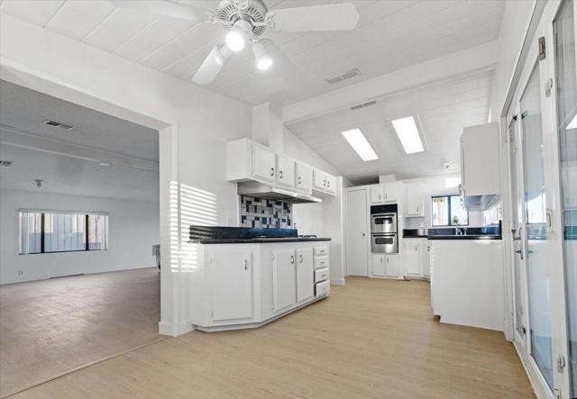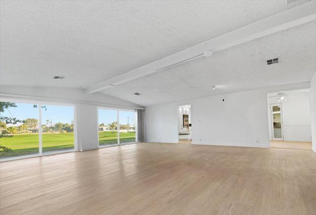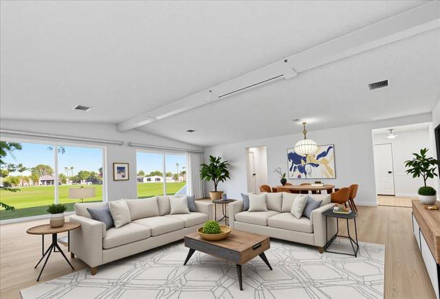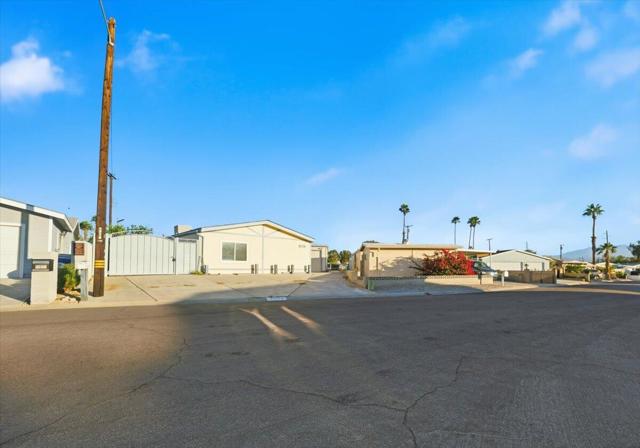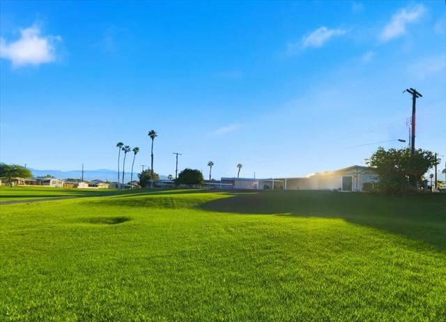 55+. Absolutely gorgeous view of golf course and mountains!! Home has lots of windows and lots of natural light. You own the land. This triple wide home sits on a large lot with a garage. Beautiful open plan with three bedrooms or third bedroom can be used as a den or office. Upgraded kitchen, drywall, new laminate throughout. There is a large, covered patio plus a secure area for additional storage or parking on the other side of the house. Beautiful cul-de-sac lot . The low monthly homeowner fee includes unlimited golf for two owners. There are two fresh, crystal pools and spas and amenities at the clubhouse. Tri Palms Estates and Country Club is located in an excellent location with every convenience nearby: Costco, Sams, Home Depot, freeway, medical facilities , restaurants, casinos and entertainment plus the Acrisure arena that features famous performers and hosts the hockey team. Living and bedroom photos showing furniture are computer generated to show how it would look furnished. The house is vacant.
