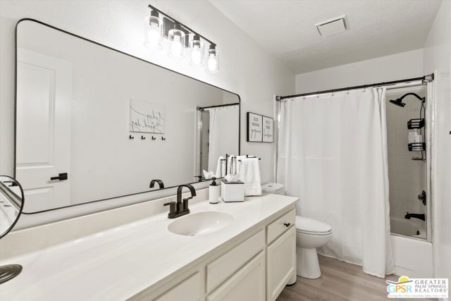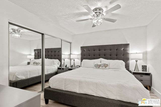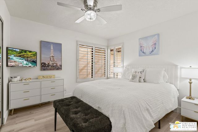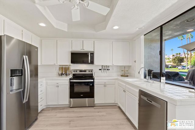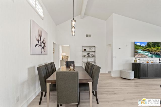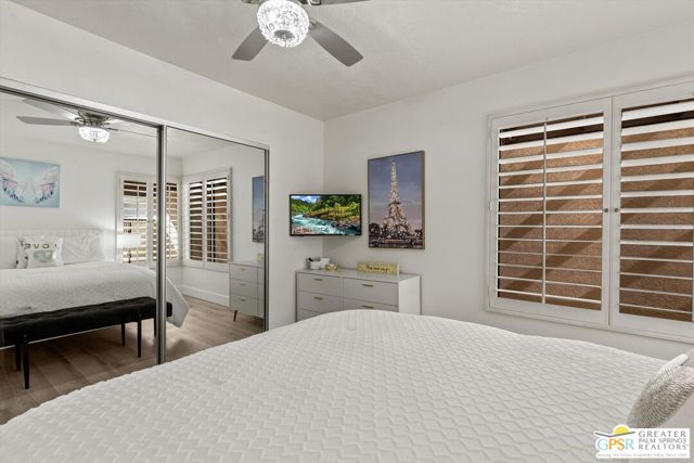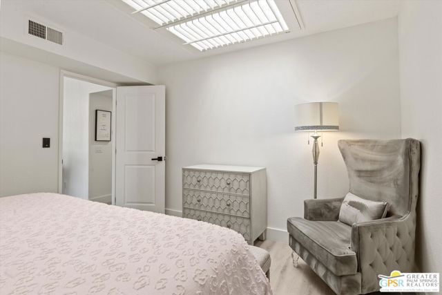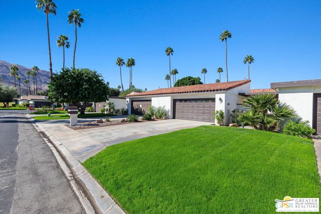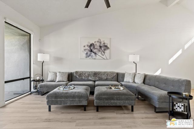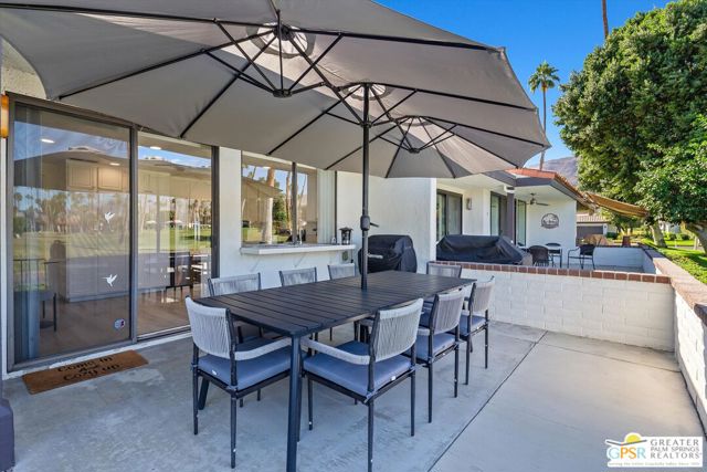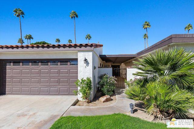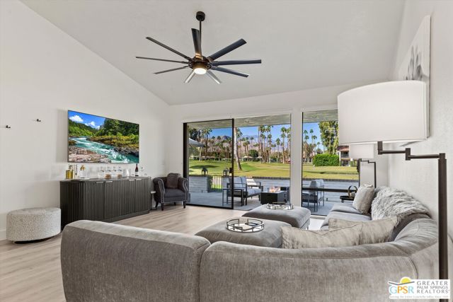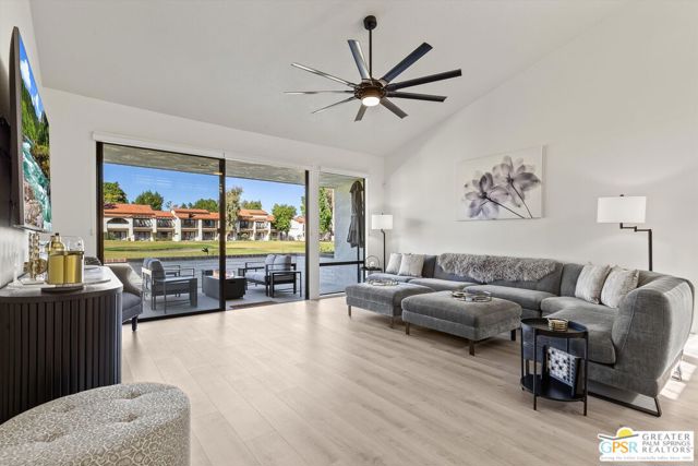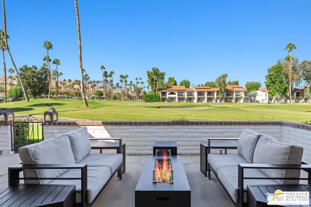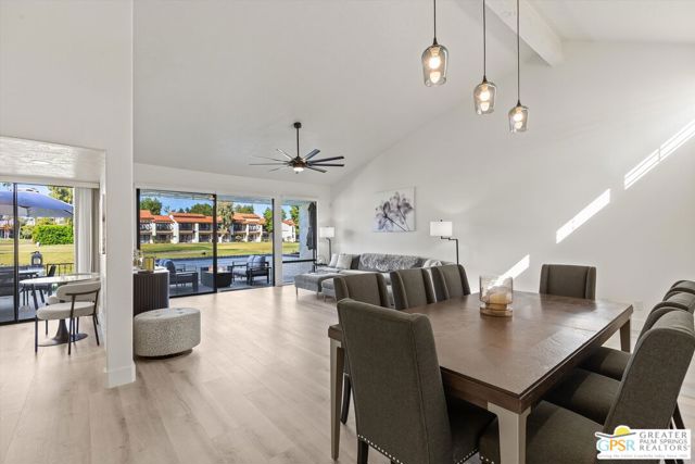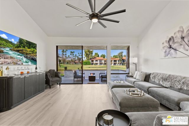 Embellished with panoramic western views of Mount San Jacinto, colorful sunsets and scenic fairways, this turnkey condo is exquisitely remodeled and impressively upgraded in Rancho Mirage's guard-gated Rancho Las Palmas Country Club. Located directly along the community's Ted Robinson-designed golf course, the open and bright residence offers a full complement of high-end, on-trend furnishings, including artwork and HDTVs. Vaulted ceilings and seamless living areas create an open and inviting setting for daily living and sophisticated entertaining both indoors, and outside in a gated entry courtyard and on a backyard patio with sun and shade areas. Approximately 1,824 square feet, the expansive single-level design lives like a four-bedroom, two-bath floorplan, with a former third bedroom/den reimagined as two bedrooms. Living and dining rooms enjoy golf course vistas and natural light streaming through clerestory windows, and the kitchen hosts new stainless steel appliances, white cabinetry, pass-thru service to the patio, recessed LED lighting, and a cafe table with seating for two. Enjoy new luxury vinyl wide-plank white oak-style flooring throughout, smooth ceilings, chic lighting, ceiling fans, plantation shutters, mirrored wardrobe doors and skylights. Further refinements are led by the comfort and efficiency of a newer HVAC system, an alarm system with flood sensors, and an attached two-car garage. Resort swimming pools and spas are merely moments from this stylish move-in-ready condo. Residents of Rancho Las Palmas Country Club also enjoy an award winning Spa, pickle ball and tennis courts, and a luxurious clubhouse with two restaurants and a fitness center. The River shopping center and its array of restaurants, shops and theaters, is located across street, and Palm Springs and Palm Desert are minutes away.