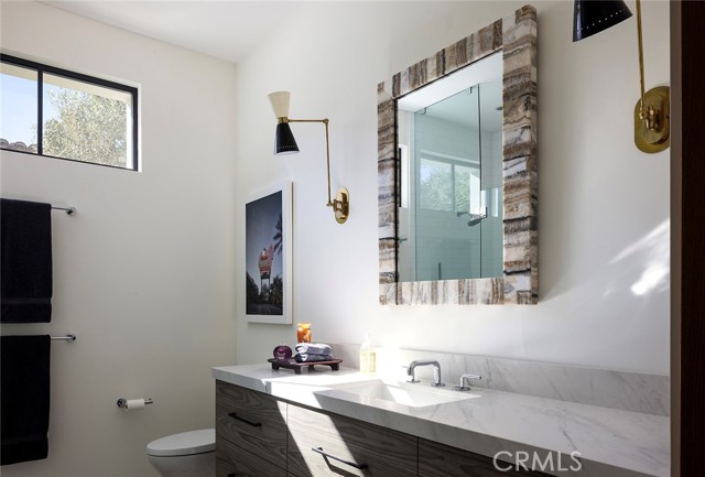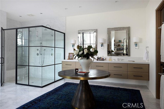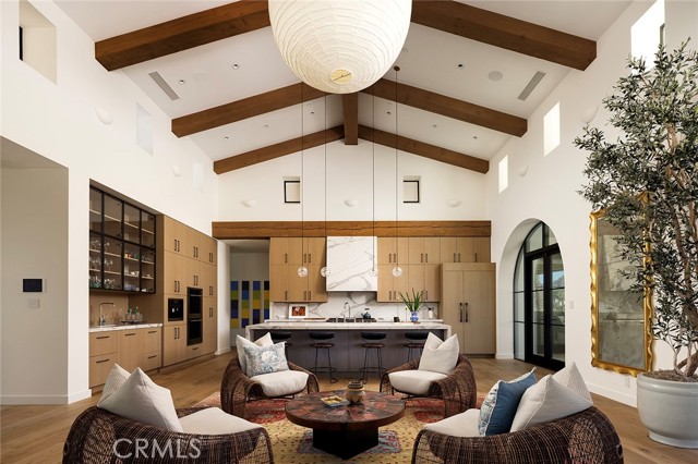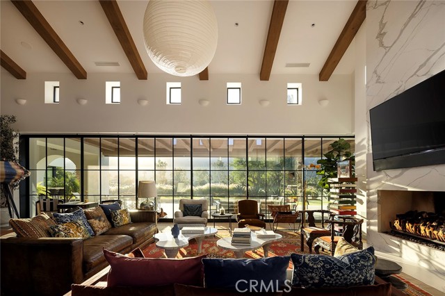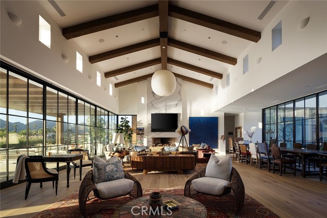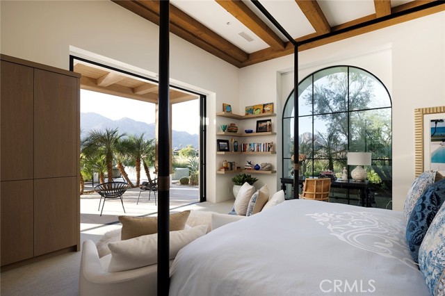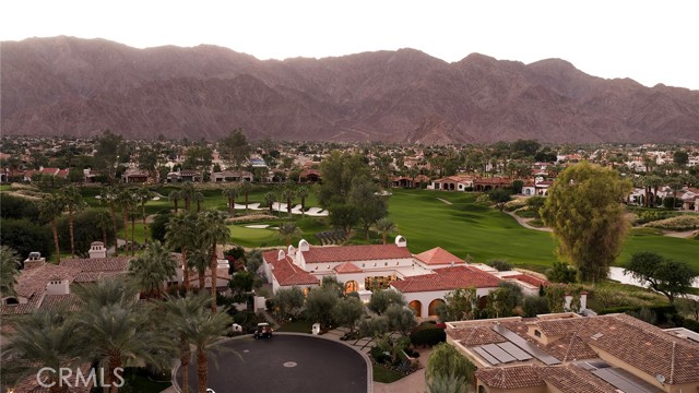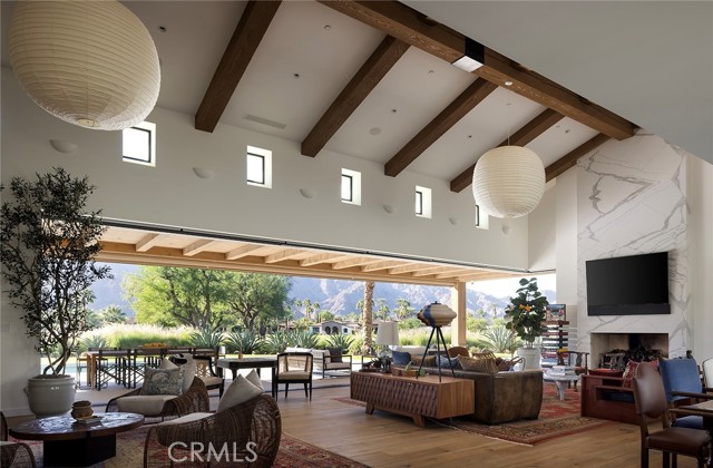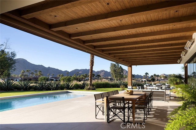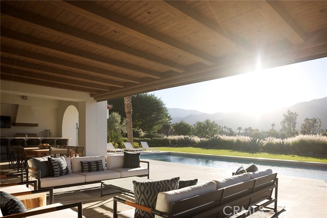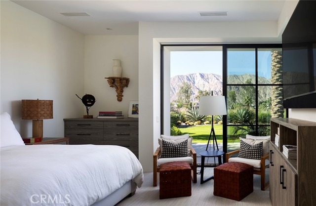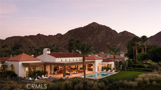 An extraordinary opportunity to own a residence of rare distinction within the prestigious Tradition Golf Club. Perfectly positioned at the end of a serene cul-de-sac, this modern hacienda commands sweeping mountain vistas from its expansive and exceptionally private homesite. Designed by acclaimed architect Gordon Stein, this architectural gem harmonizes bold modern lines with warm, organic materials to create a timeless desert sanctuary. Dramatic glass walls and cathedral beam ceilings frame captivating views and bathe the interiors in natural light. Automated sliding doors blur the boundaries between indoors and out, opening to a covered patio complete with a full outdoor bar, built-in grill, fire pit, and an upgraded surround sound system - perfect for elegant entertaining or tranquil evenings beneath the desert sky. The resort-style pool and large grass area overlook holes four and five of Tradition's golf course. Throughout the home, wide-plank oak floors, contemporary designer lighting, and refined natural textures establish a sense of understated luxury and cohesion. The chef’s kitchen features a porcelain waterfall island, bespoke cabinetry, and top-of-the-line appliances. Adjacent to the great room, an office alcove and exquisitely designed powder room reflect the home’s meticulous attention to detail. The primary suite serves as a serene retreat, with floor-to-ceiling windows and pocket doors that dissolve the boundary between comfort and scenery. The spa-inspired bath exudes tranquility with curated finishes, while a motorized TV lift allows seamless transitions between cinematic viewing and unobstructed mountain panoramas. Two guest suites in the main residence offer stylish accommodations, while a detached casita - complete with a private living area, kitchenette, and ensuite bedroom - welcomes visitors with the utmost privacy and comfort. Enhanced by a state-of-the-art smart home system, this 2020-built residence is both technologically advanced and effortlessly livable. Distinguished among the community’s finest homes, this property epitomizes modern desert elegance - a flawless fusion of architecture and sophistication within one of La Quinta's most coveted enclaves. This is more than a home; it’s an opportunity to live the Tradition Golf Club lifestyle, where world-class golf, stunning natural beauty, and architectural excellence converge.