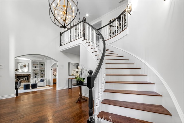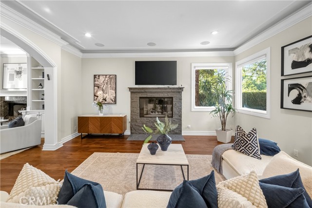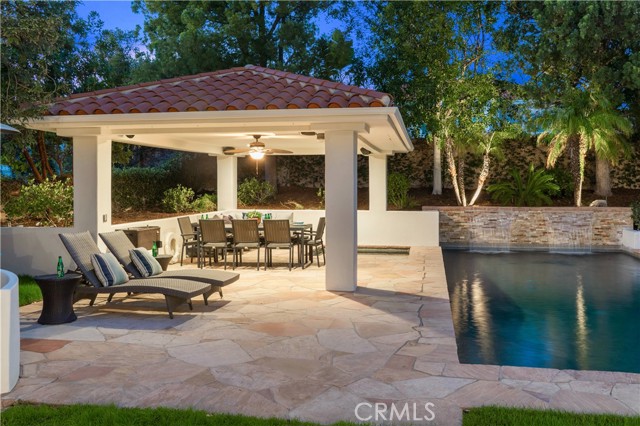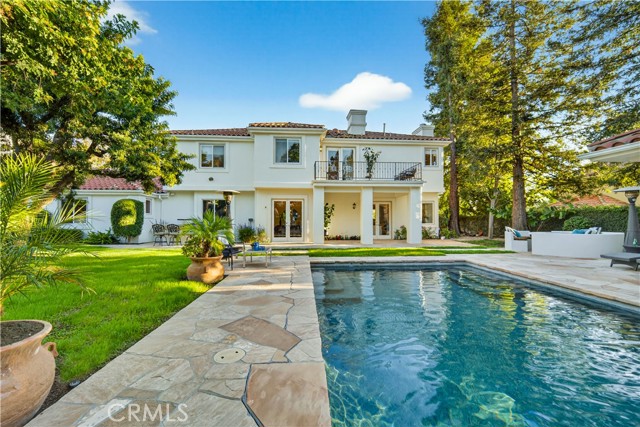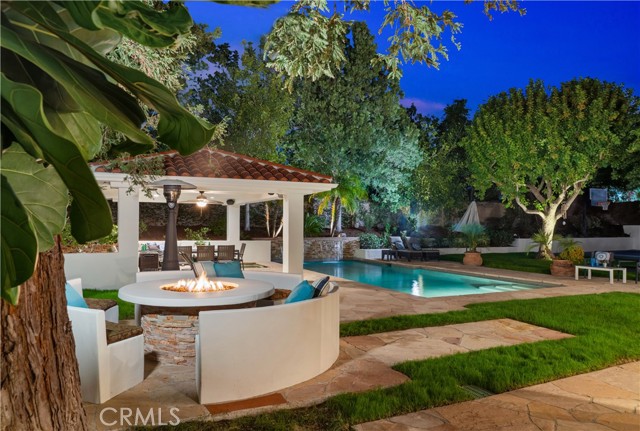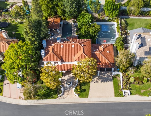 Tucked at the end of a quiet cul-de-sac in prestigious Mountain View Estates, this custom home offers exceptional privacy and one of the community’s most impressive backyards. Designed for entertaining, the private, estate-style grounds feature a large sparkling pool with tranquil waterfall, spacious sports court, covered pavilion with built-in cooling misters, relaxing hot tub, fire pit lounge, and an outdoor sound system—all shaded by mature trees and surrounded by lush landscaping. Inside, a grand double-door entry and sweeping staircase introduce light-filled interiors with high ceilings and rich engineered hardwood floors. The kitchen—renovated by an international designer—showcases beautifully detailed custom cabinetry, a striking waterfall island, sleek quartz counters, Sub-Zero and Wolf appliances, and a built-in wine fridge with beverage drawers. The formal dining room displays elegant wainscoting and coffered ceilings, while the living room features refined built-ins and French doors that open to the backyard. The floor plan offers exceptional versatility, with one ensuite bedroom (complete with private entrance) conveniently located on the main level, and four additional bedrooms upstairs—ideal for guests, extended stays, or flexible use. A spacious family room with an entertainer’s bar and a newly renovated shared ensuite with custom cabinetry add to the home’s thoughtful design. Upstairs, the luxurious primary suite includes a private sitting area and large balcony overlooking the peaceful, resort-style backyard—an inviting retreat to relax and unwind. The spa-inspired bath features a walk-in shower, jacuzzi tub, dry sauna, large custom walk-in closet, and separate vanity area. Additional highlights include updated lighting, custom closet organizers, and upgraded garage motors. One of the A/C units was replaced in 2021, and the water heater in 2022—completing a home that blends refined detail with effortless livability inside and out. Set within one of Calabasas’ most sought-after guard-gated neighborhoods, Mountain View Estates is known for its wide tree-lined streets, 24/7 security with two manned gates, and beautiful tennis and pickleball courts. Residents enjoy top-rated Las Virgenes schools, a neighborhood park just outside the back gate, scenic hiking trails, and close proximity to the iconic beaches of Malibu, along with Calabasas’ finest shopping and dining.