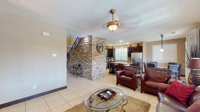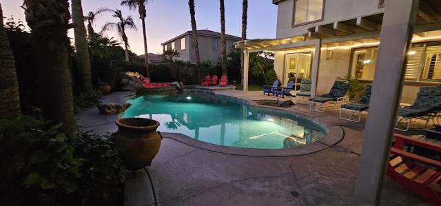 Located in Bella Vida in Indio, this warm, inviting 6 bedroom + den / 3 bath home is sold turnkey furnished and ready to enjoy. Perfect as a family residence, second home escape, or investment purchase--this home has been used as a successful seasonal/vacation rental and may offer strong income opportunity (buyer to verify any permit requirements with the City). The spacious floorplan offers comfortable gathering spaces, open concept living, and great natural light throughout. The kitchen features granite countertops, stainless appliances, kitchen island with breakfast bar, and opens to the living + dining area for easy entertaining. Beautiful stone accents, plantation shutters, and warm color tones create a welcoming interior environment. Outside, enjoy the private backyard with pool, spa, waterfall feature, colored lighting, Alumiwood covered patio, built-in outdoor kitchen and counters, and mountain views--no homes behind you. Near schools, shopping, dining, entertainment, golf, and the world-famous Empire Polo Grounds. No HOA. Move in ready and lifestyle ready--just bring your suitcase.
