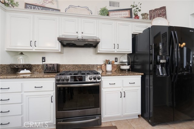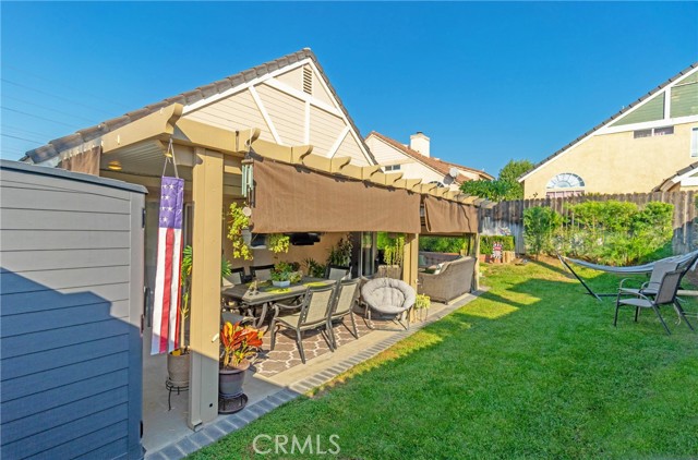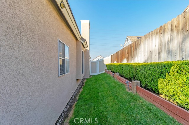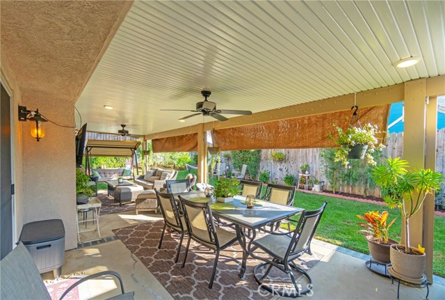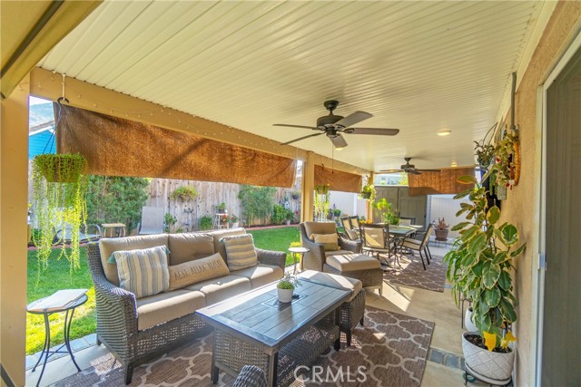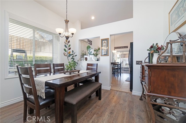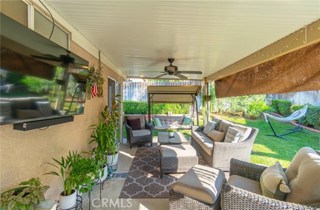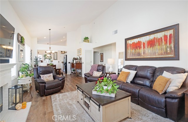 SPECTACULAR SINGLE STORY HOME ON PRIME LOT IN SOUTHRIDGE VILLAGE! Completely remodeled with exquisite features and contemporary neutral décor that will compliment your furnishings! Feel refreshed in this light, open floor plan with raised vaulted ceilings and newly painted interior – a wonderful canvas for your inspired design ideas. You are invited to relax in a comfortable living room with a toasty fireplace with a brick surround, wide mantle, and plenty of space for your media center. This open concept space flows into the dining area, making this the ideal room for fun memories at large holiday get-togethers! The chef in your family will appreciate the sleek, thoroughly remodeled kitchen with top line appliances (new stove with 5 burner gas range, new dishwasher) and ample cabinetry with soft close doors. Gleaming polished granite tops enhance the kitchen’s functionality and style. Start your day at the breakfast area with a sliding glass door that invites you to lounge beneath the exceptional covered patio. If you are looking for a home that provides that coveted indoor-outdoor SoCal lifestyle, this is the one! Enjoy gorgeous upgraded new vinyl plank flooring that flows seamlessly with matching upgraded carpeting and warm earth toned tile flooring. The baseboards are new, as are the window casings and custom blinds. Three generous sized bedrooms include the primary suite that boasts a vaulted ceiling, private access to the covered patio, and an elegant ensuite bathroom. Enjoy the ensuite bathroom with double sinks, granite vanity, new toilet and more. Both bathrooms have been thoroughly upgraded, and both have a shower/tub combo. The list of upgraded items continues with a freshly painted exterior, new AC and furnace, and new water heater. Your eyes will be instantly drawn to the amazing mountain view from this delightful manicured backyard! Designed to feel like a swanky private get-away, this spacious patio with an extensive aluminum cover is fully equipped with ceiling fans and recessed lighting. This outdoor entertainment space will inspire you to host fun BBQs in any weather! We are convenient to nature hiking trails, mountain biking, parks, and recreation. Shopping and entertainment opportunities are mere minutes away, as are award winning schools! There are NO HOA DUES here. This spotless single-story gem is the perfect place to call “Home Sweet Home!”