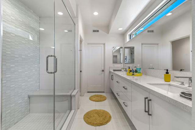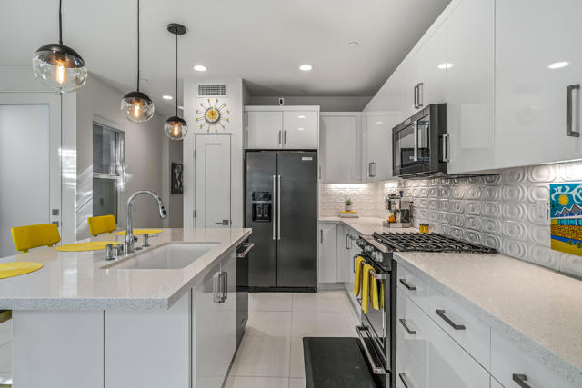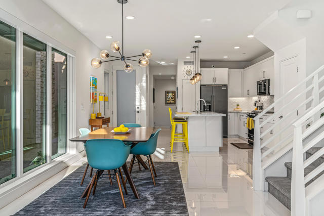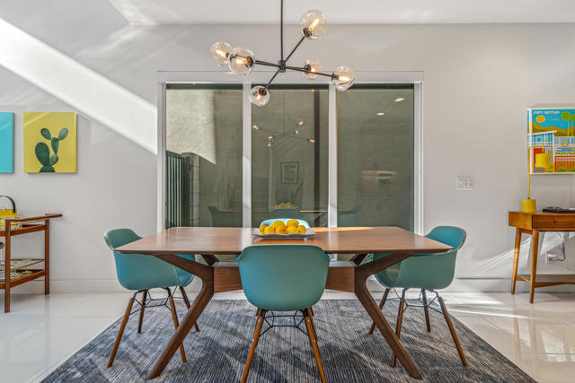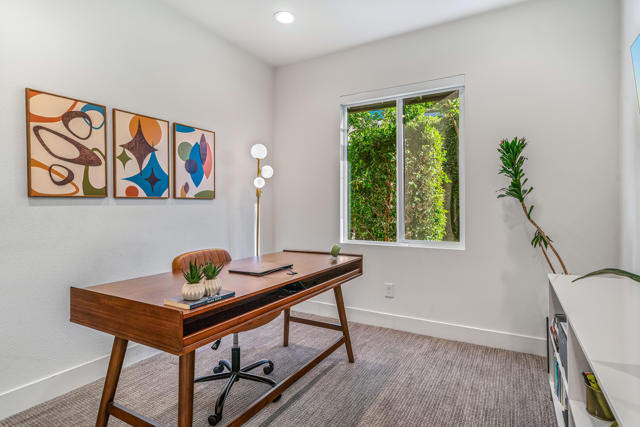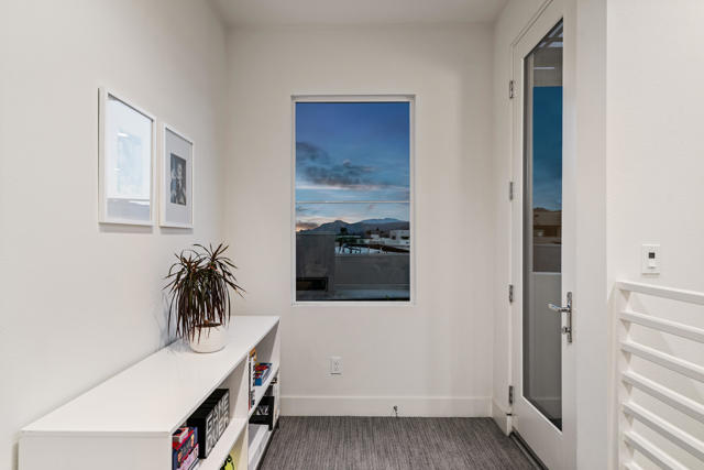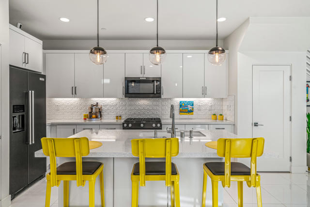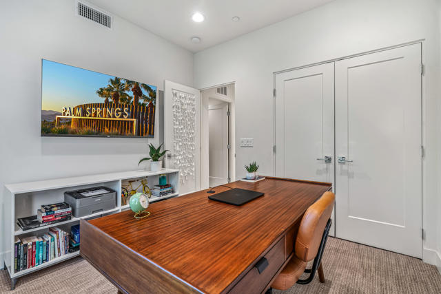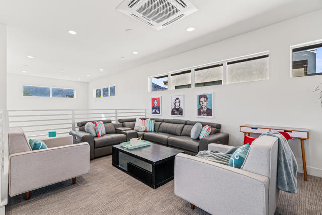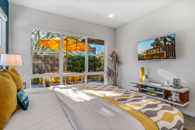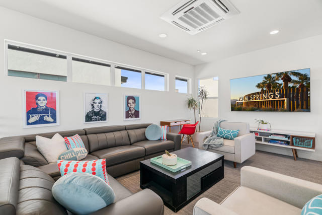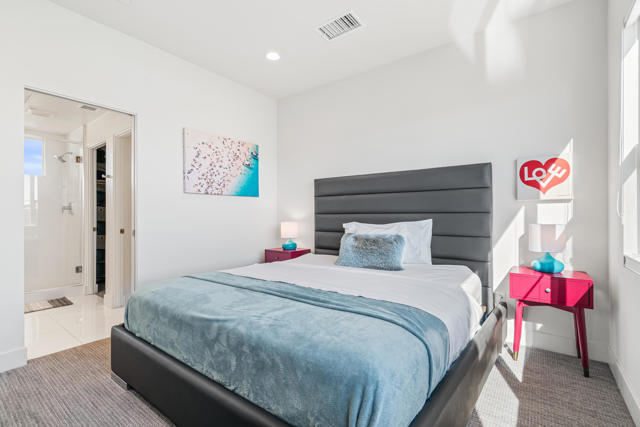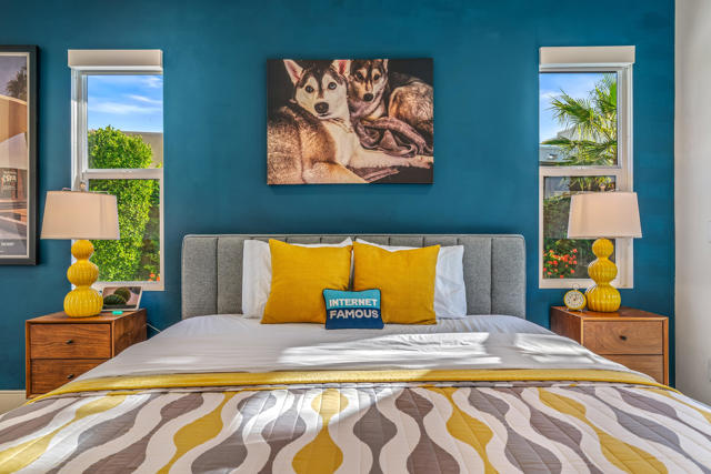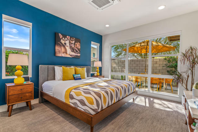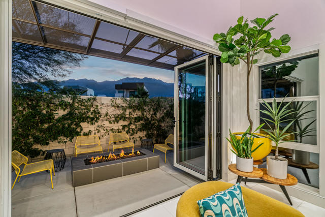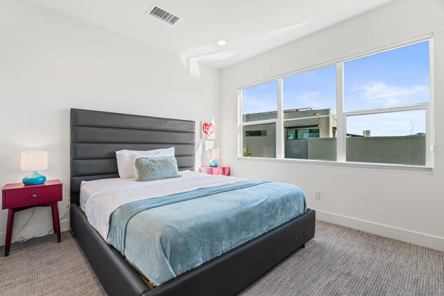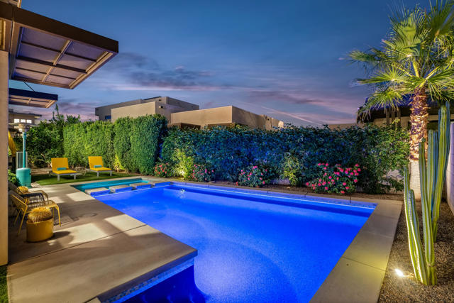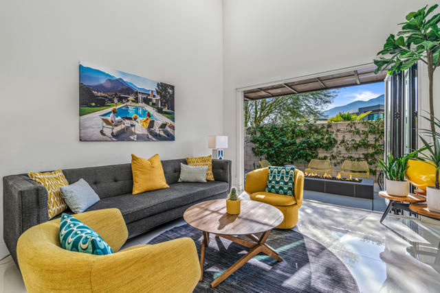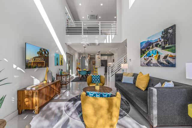 Once upon a place ... Imagine one of the most sought-after floor plans, perfectly positioned on an oversized, pie-shaped lot with a sparkling saltwater pool and spa--framed by breathtaking mountain views that stretch as far as the eye can see. Welcome to 131 Vibe Way, a modern masterpiece in the highly desirable Vibe Community, offered turnkey furnished for immediate move-in to enjoy the best of Desert Living. This stylish gem features 3 bedrooms, 3 bathrooms, and a sprawling wraparound yard designed for ultimate relaxation and entertainment. Step inside and discover a gourmet kitchen with quartz countertops, designer backsplash, and an airy open-concept layout flowing seamlessly into the living and dining spaces. Fully retractable folding doors blur the lines between indoors and out--creating the perfect Palm Springs vibe for al fresco evenings under the stars. The main-level primary suite is your private retreat, featuring a spa-inspired bathroom and an oversized walk-in closet. You'll also find a spacious guest bedroom, a full bath, and a convenient laundry room on this level. Upstairs, the loft feels like a perch in the clouds--a light-filled bonus space ideal for a media room, home office, or gym with panoramic mountain views that simply take your breath away. The second primary ensuite offers another luxurious escape for guests and an oversized balcony with views galore. Upgrades abound include owned solar, a professionally designed backyard with low-maintenance turf and outdoor firepit, two-car garage with frosted glass door, tankless water heater, and ample storage. Residents of The Vibe enjoy resort-style amenities including a heated pool and spa, expansive sun deck, clubhouse with outdoor grill, two dog parks, EV charging stations, and bocce ball courts. Whether you're searching for a full-time residence, a stylish second home, or a lucrative vacation rental, this one-of-a-kind property truly has it all.