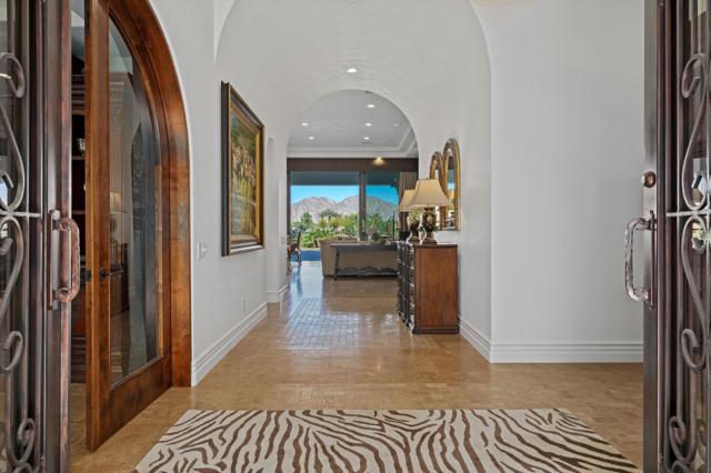 Enjoy all that Andalusia at Coral Mountain has to offer in this fabulous golf course home, perfectly situated on an elevated lot above the 8th fairway of the Rees Jones-designed course. Boasting breathtaking views of three fairways, a serene lake, and the majestic Santa Rosa and Coral Mountains, this residence offers a dramatic lifestyle with all the essentials for entertaining. The spacious open floor plan is offered furnished and features two expansive primary suites, each with luxurious, spa-like baths for ultimate relaxation. Guests will feel right at home in the detached two-room casita, complete with a cozy fireplace, private bedroom and bath, and a kitchen bar with a refrigerator and microwave. The great room is beautifully finished with custom built-ins, travertine flooring, shutters, electric solar shades, volume ceilings, and expansive glass doors that open to an incredible covered outdoor living area. The chef's kitchen features a large center island, premium appliances, and a butler's pantry. Step outside to your own private backyard paradise, where a sparkling pool and spa take center stage, complemented by a built-in BBQ island--all framed by unrivaled golf course and mountain views. Come live the life you've always imagined!